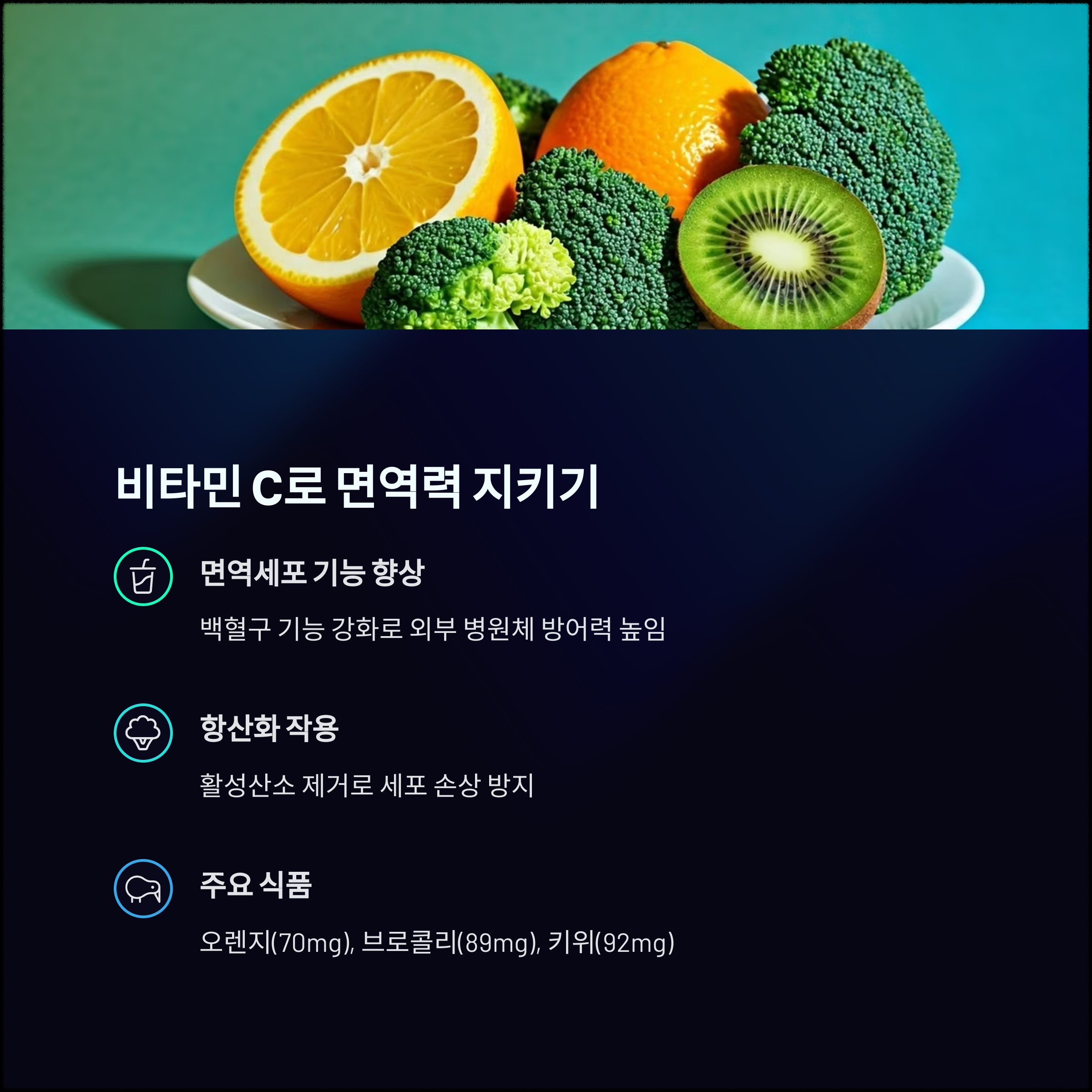 비타민 C는 항산화 작용을 통해 세포 손상을 막아주고 면역세포가 외부 병원체에 대응하는 능력을 키워줍니다. 다양한 식품 중 특히 신선한 과일과 채소가 좋은 공급원이 되며, 이를 날것으로 섭취할수록 영양소 손실이 적습니다. 꾸준한 섭취 습관은 여러분의 면역 체계를 더욱 탄탄하게 만들어 줄 것입니다.