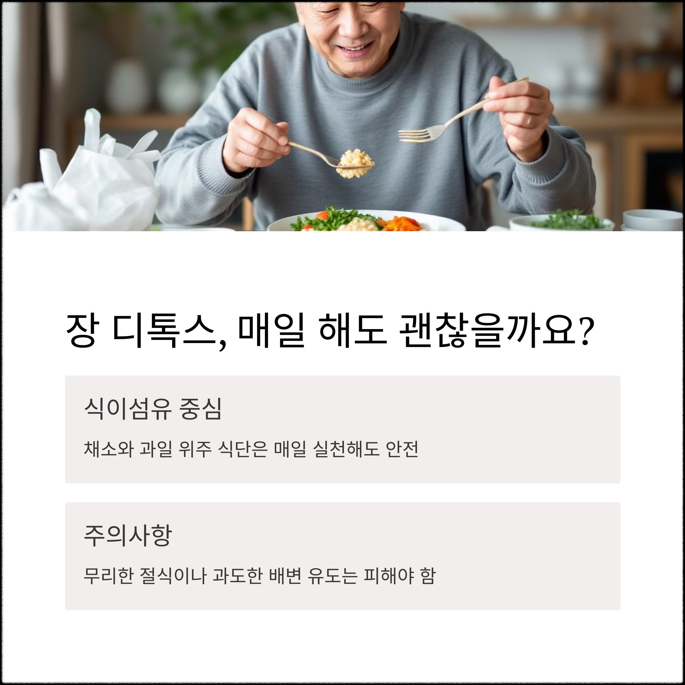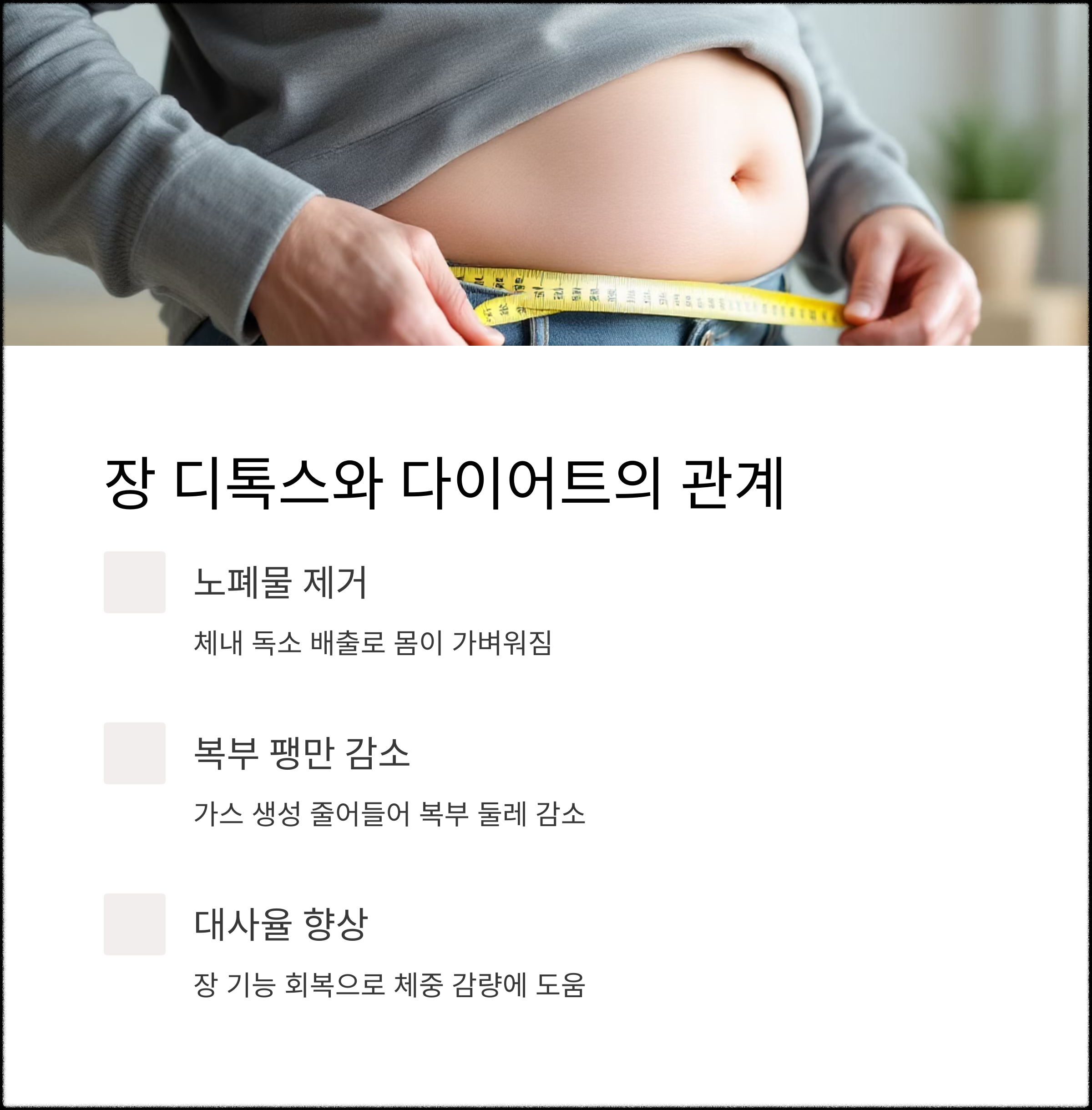 | 장 디톡스란? | 장내 유해물질을 제거해 장 기능을 회복하는 건강법 |