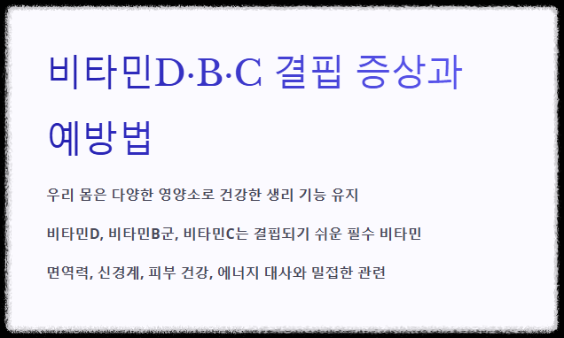 우리 몸은 다양한 영양소를 통해 건강한 생리 기능을 유지한다. 그중에서도 비타민D, 비타민B군, 비타민C는 일상 속에서 결핍되기 쉬운 대표적인 수용성 및 지용성 비타민이다. 이 비타민들은 각각 면역력, 신경계, 피부 건강, 에너지 대사 등과 밀접한 관련이 있어 결핍 시 다양한 신체 이상 증상이 나타난다. 본 글에서는 비타민D·B·C 결핍 증상과 예방법에 대해 쉽게 이해할 수 있도록 설명하며, 누구나 실천할 수 있는 예방 방안을 함께 제공한다.