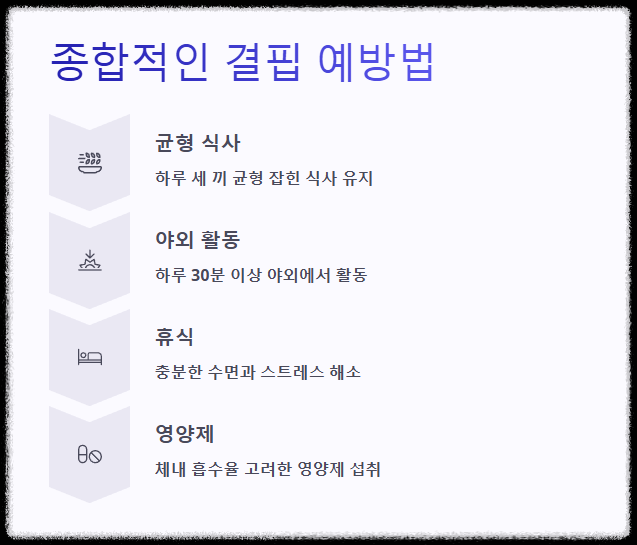 주요 결핍 증상 : 뼈 통증 및 골다공증 위험 / 근육 약화 및 만성 피로 / 면역력 저하, 감염에 자주 걸림 / 우울감 및 기분 저하