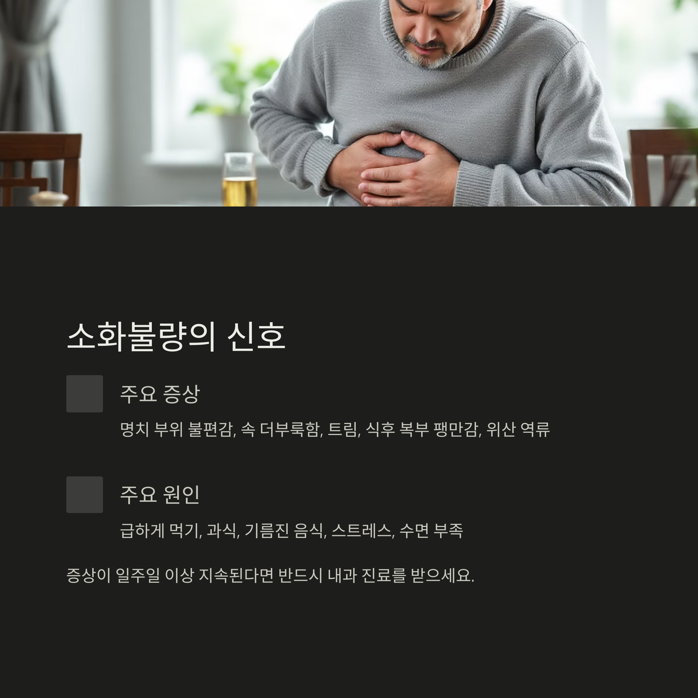 - 소화제 복용 후에도 증상 호전이 없음