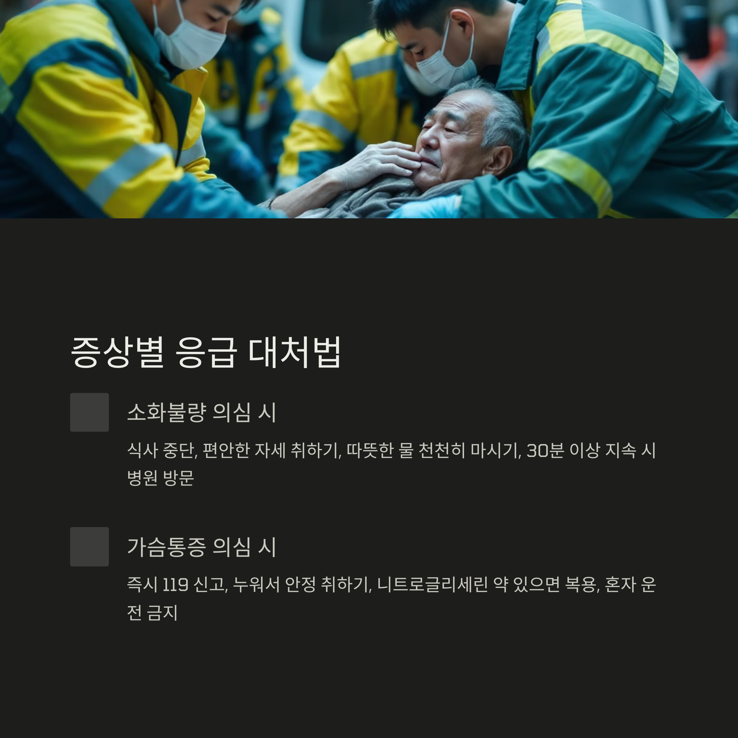 | 가슴통증 의심 | 즉시 119 신고, 누워서 안정 취하기 |