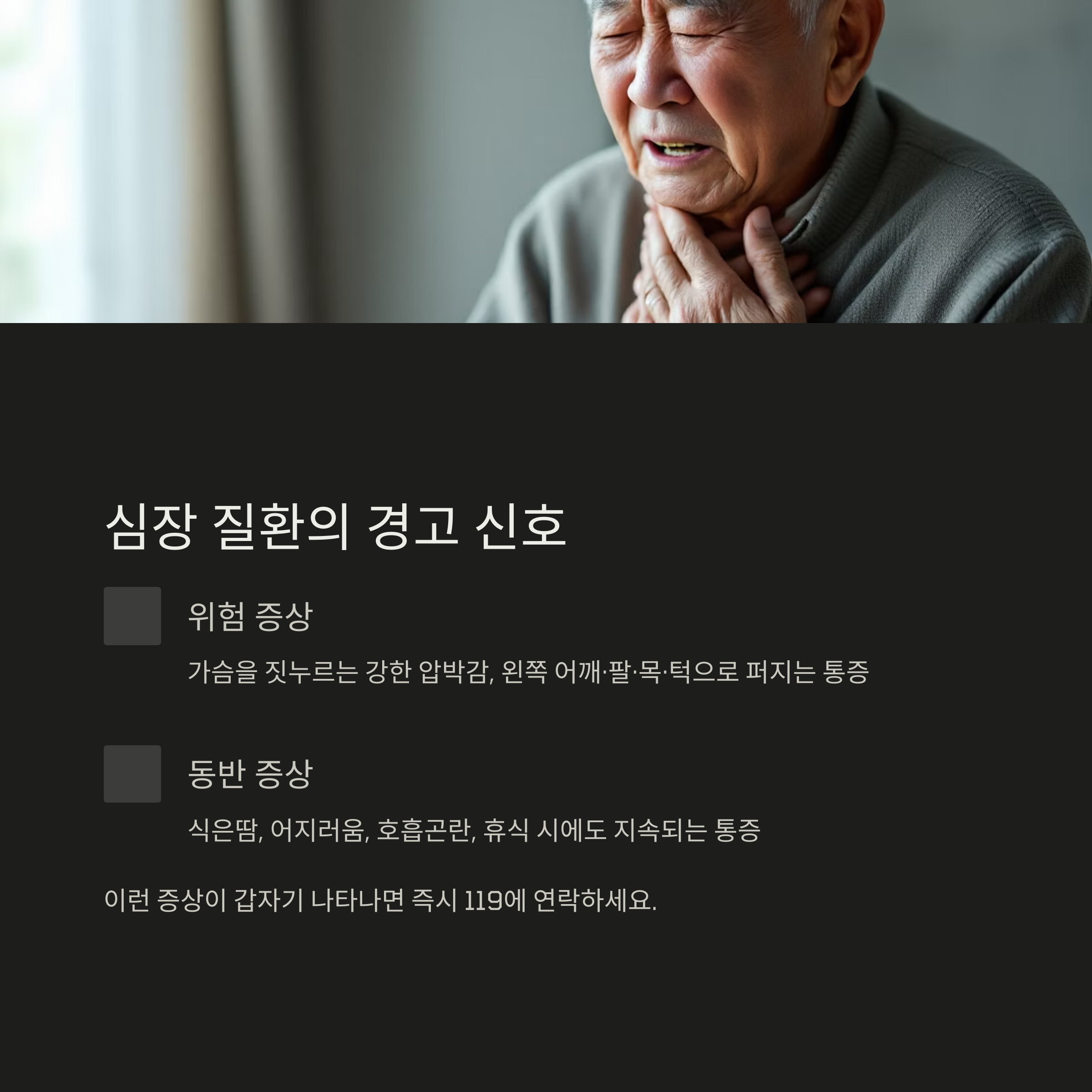 가장 흔한 질환은 협심증과 심근경색입니다. 다음과 같은 증상이라면