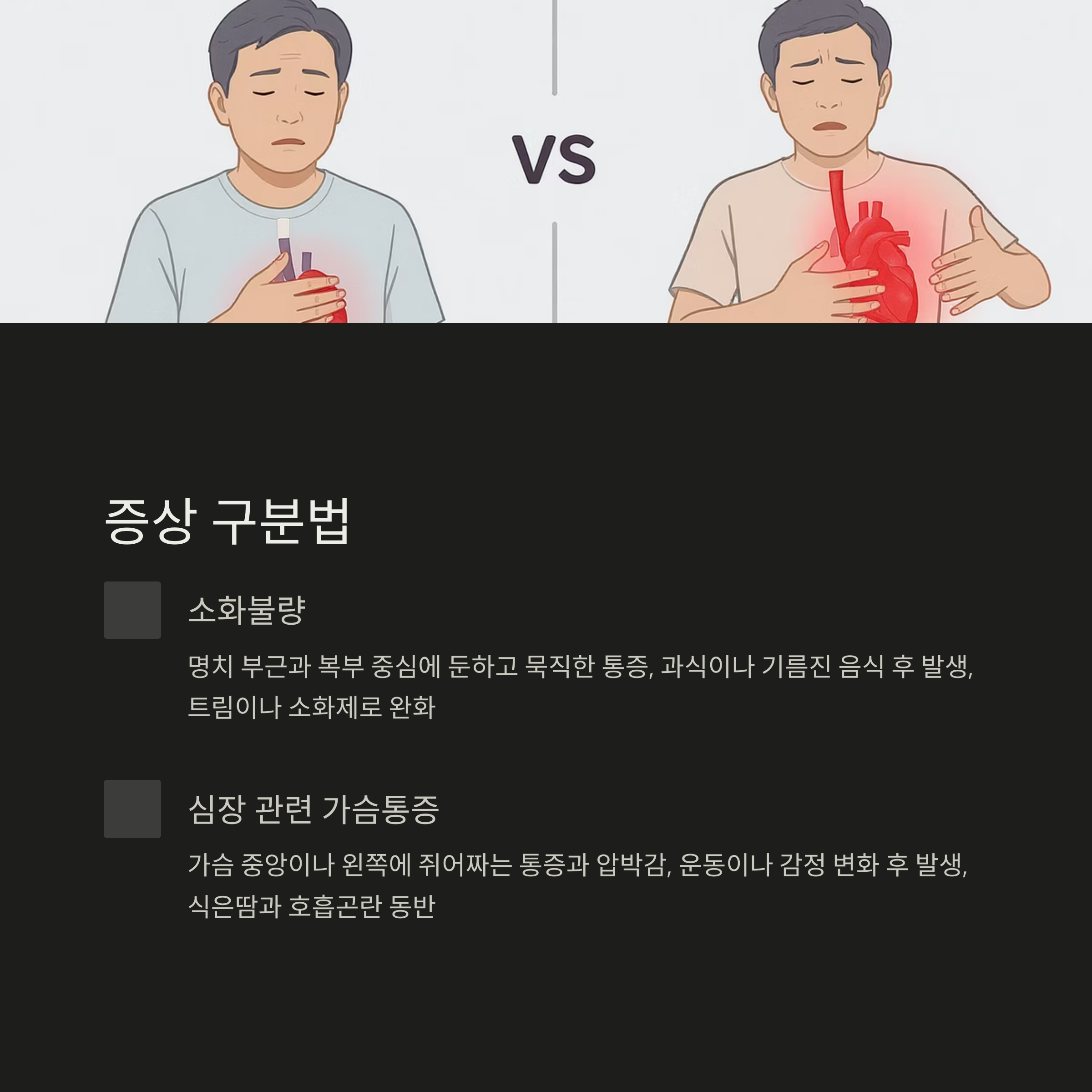 동반 증상 | 더부룩함, 트림, 메스꺼움 | 식은땀, 호흡곤란, 현기증 |