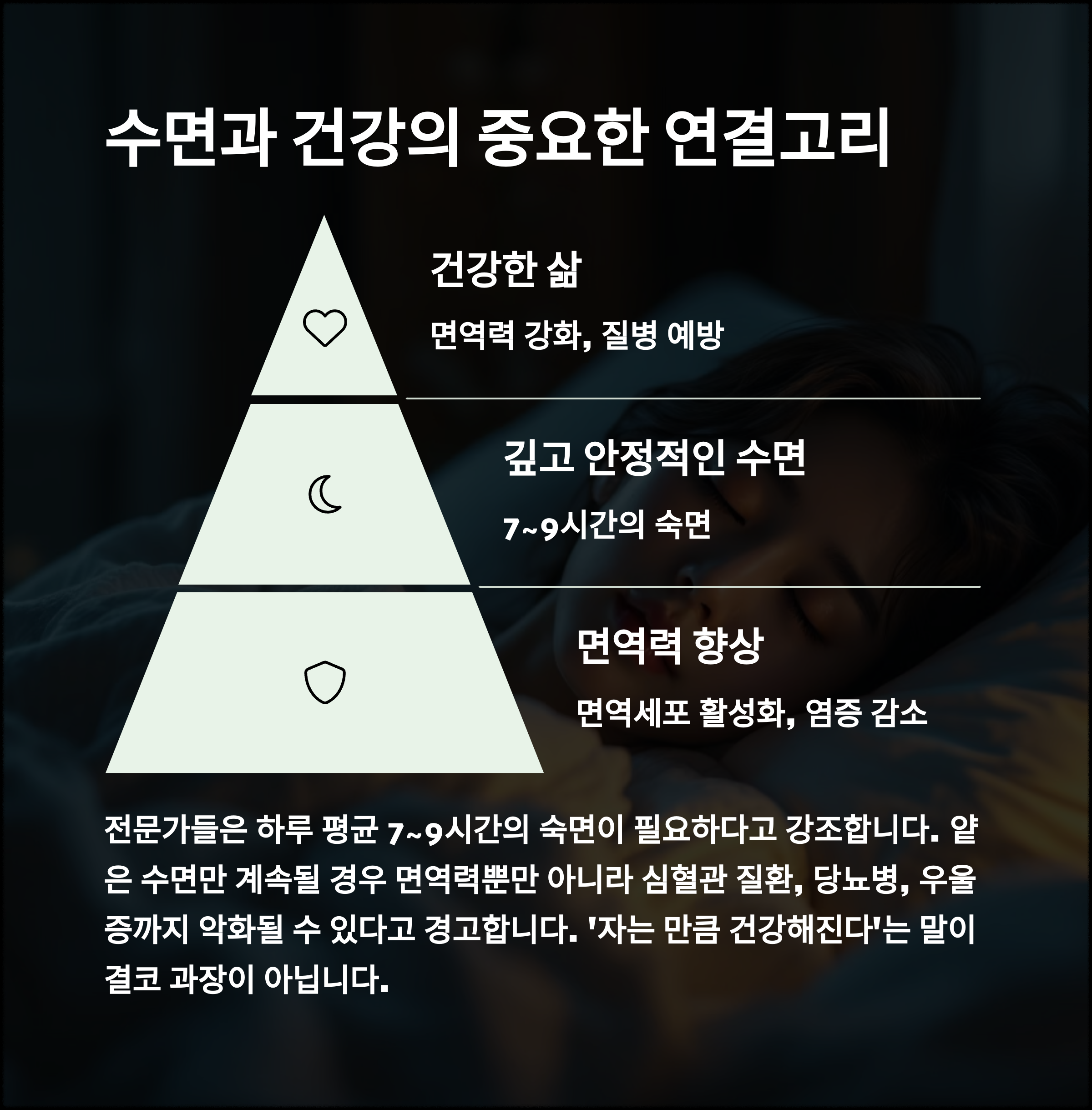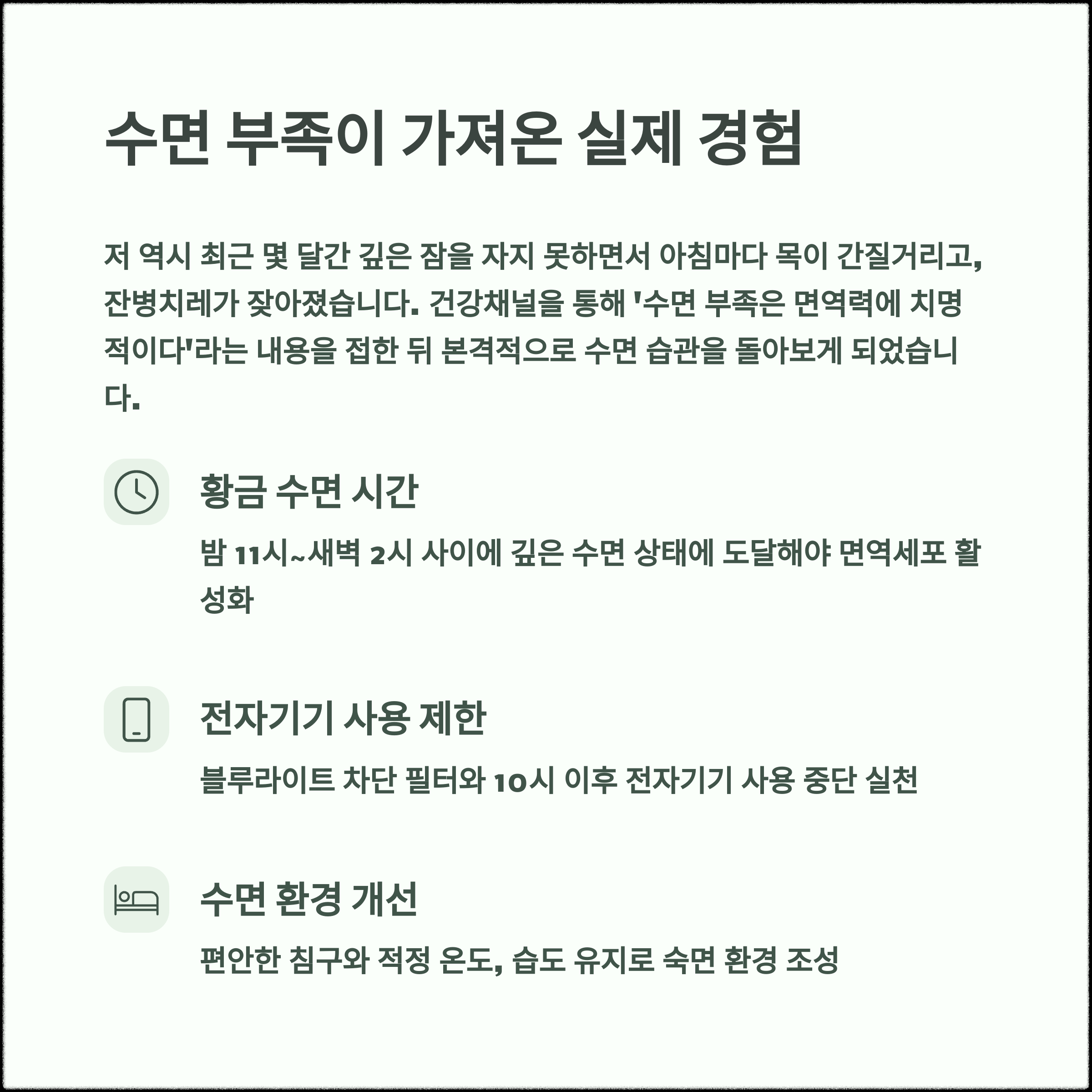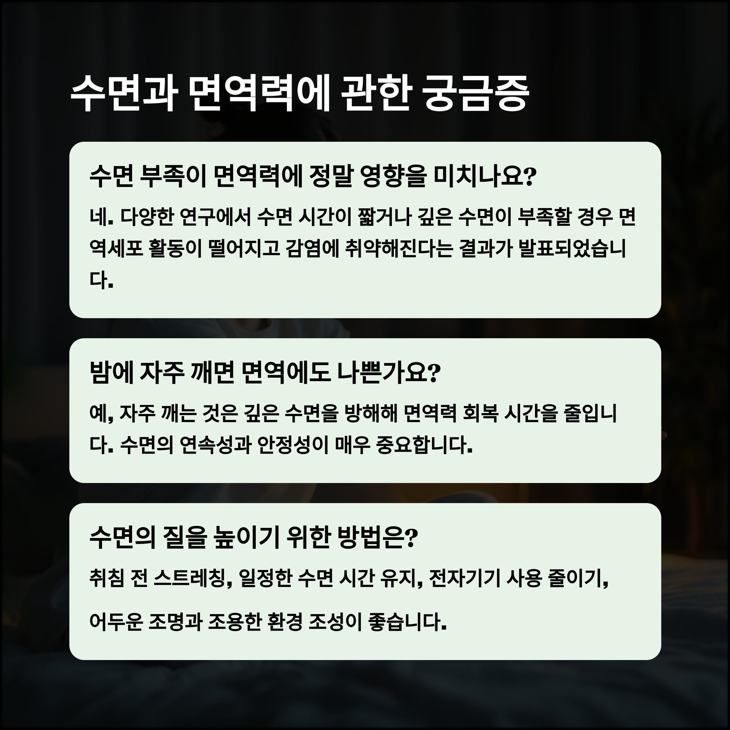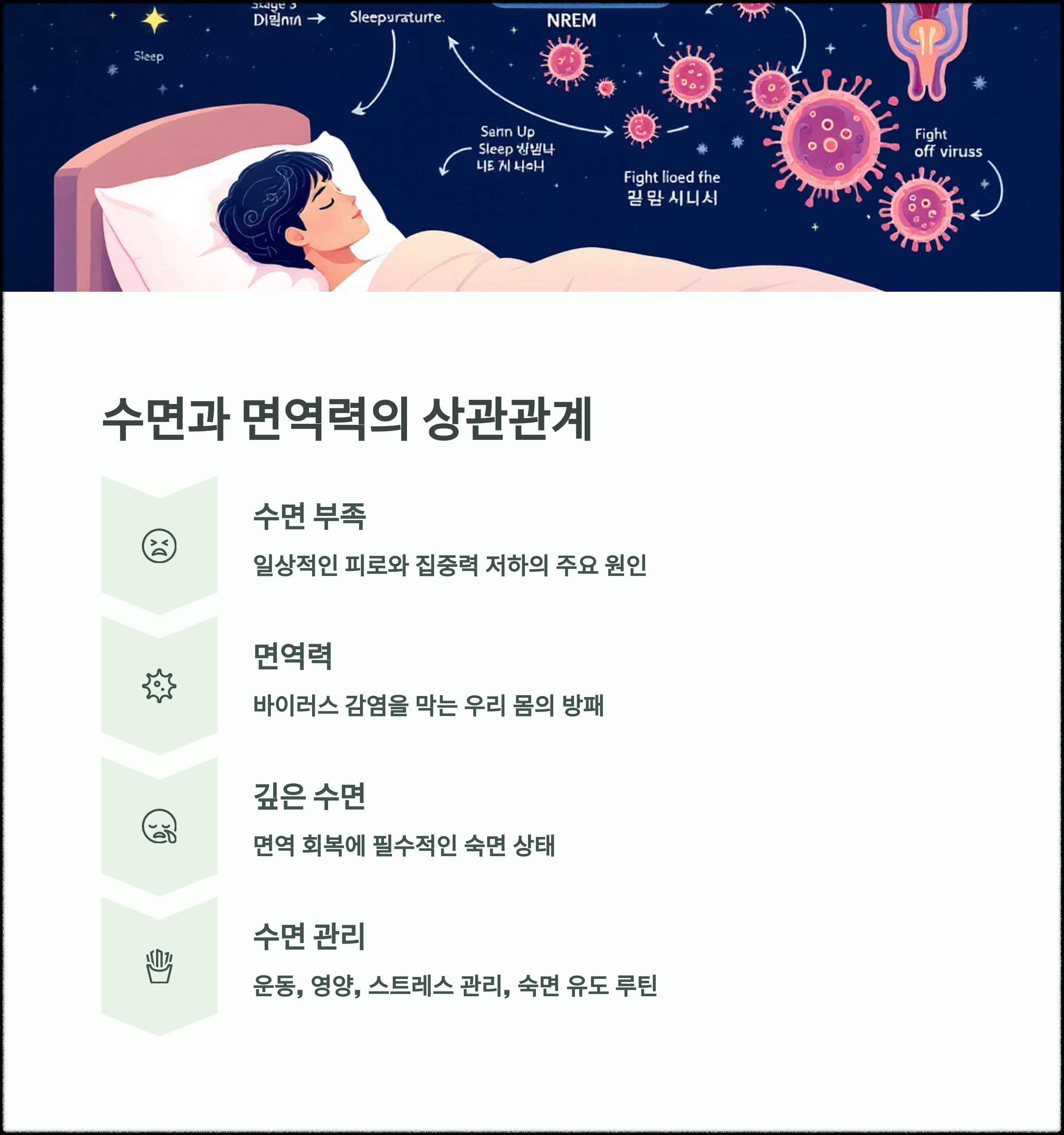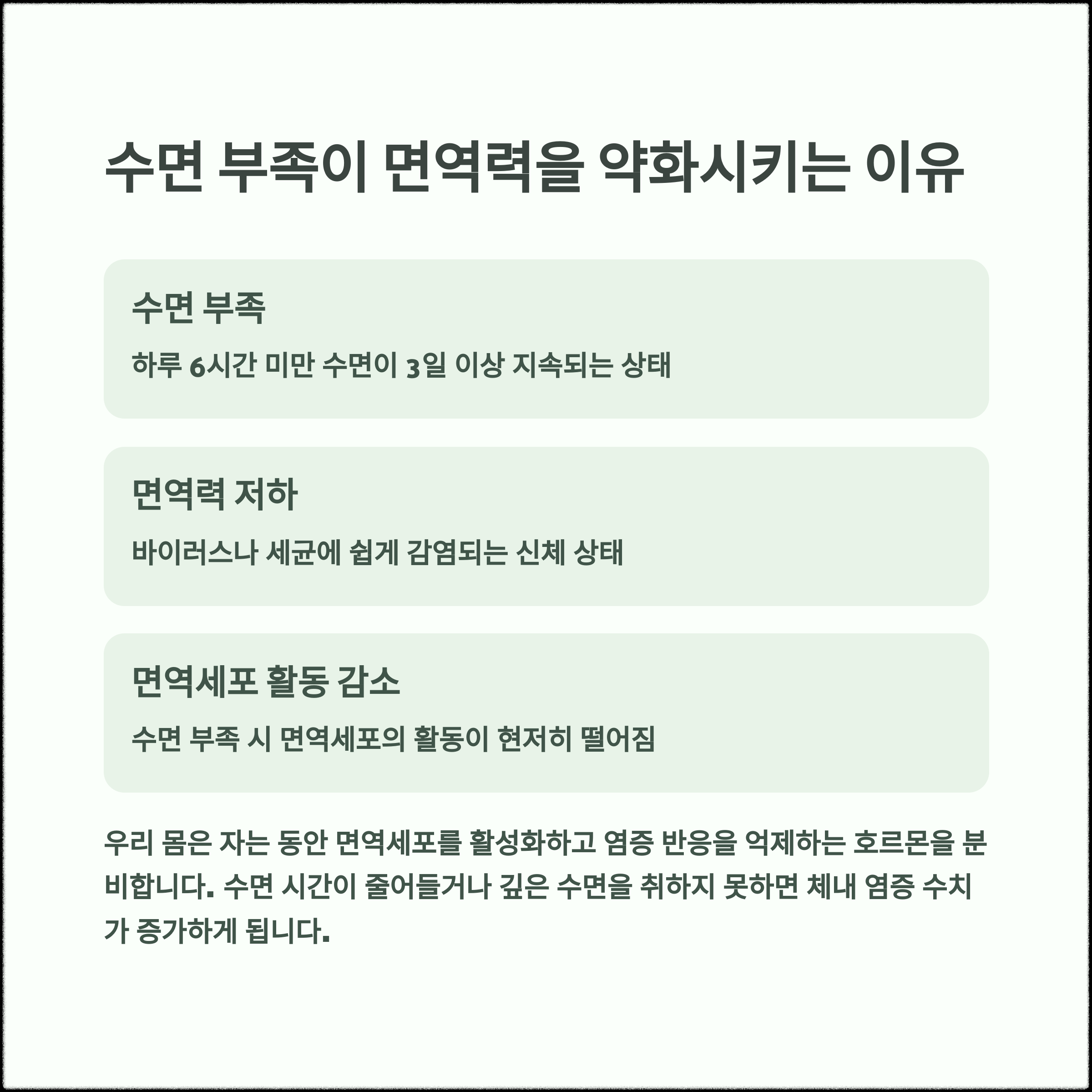 | 일상적인 피로와 집중력 저하의 주요 원인 | 바이러스 감염을 막는 우리 몸의 방패 | 면역 회복에 필수적인 숙면 상태 |