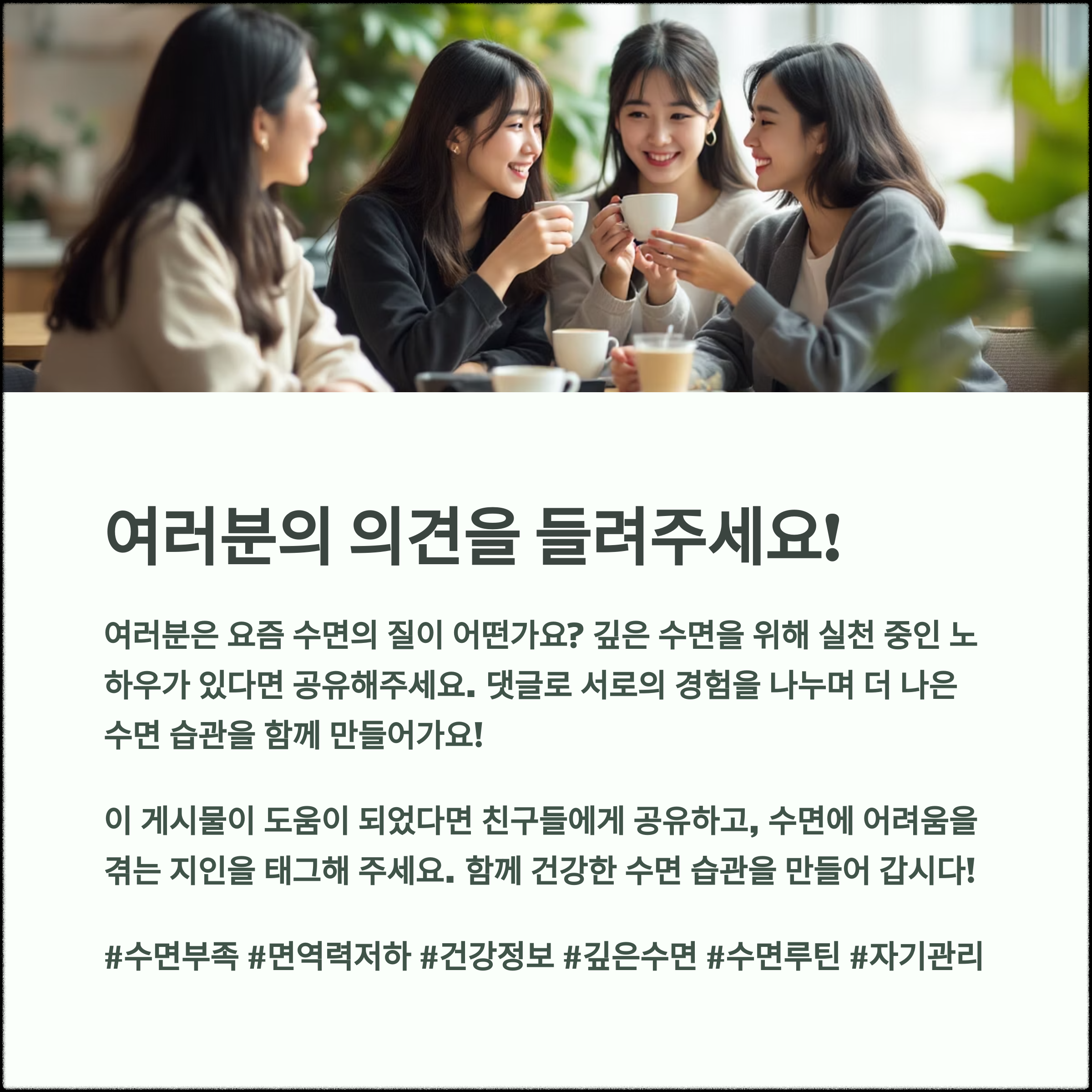 여러분은 요즘 수면의 질이 어떤가요? 깊은 수면을 위해 실천 중인 노하우가 있다면 공유해주세요. 댓글로 서로의 경험을 나누며 더 나은 수면 습관을 함께 만들어가요!