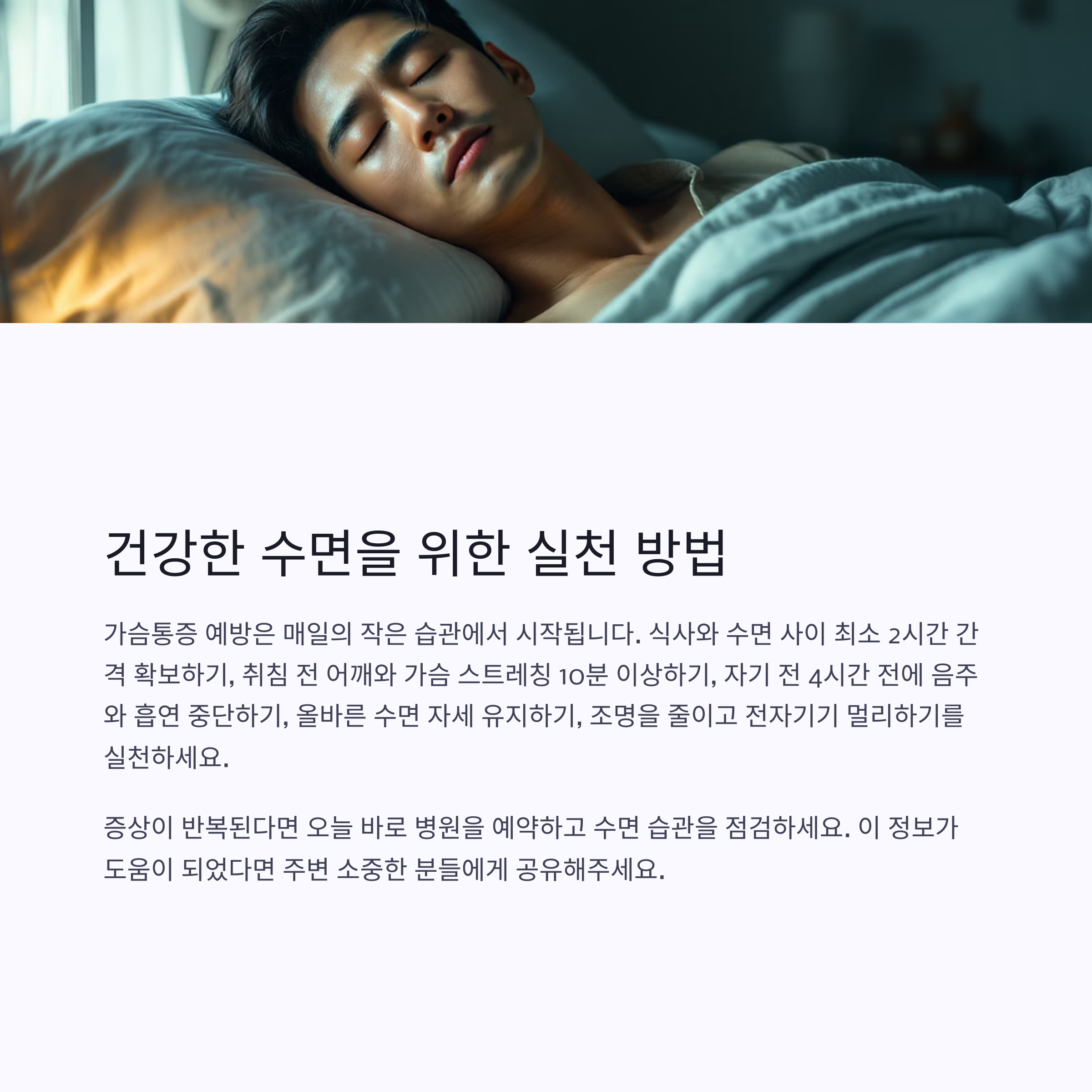 자는 중 갑작스러운 가슴 통증으로 잠에서 깬 적 있으신가요? 단순히 스트레스로 넘기기엔 그 증상이 심상치 않을 수 있습니다. 이 글에서는 수면 중 가슴통증이 발생하는 정확한 원인과, 현재 기준으로 알려진 검증된 해결법까지 자세히 알려드립니다. 단순 불편함부터 생명을 위협하는 질환까지 다양한 원인이 숨어있기 때문에, 지금 이 글을 읽고 계신다면 정확한 정보를 통해 즉시 점검하고 대처하는 것이 매우 중요합니다.