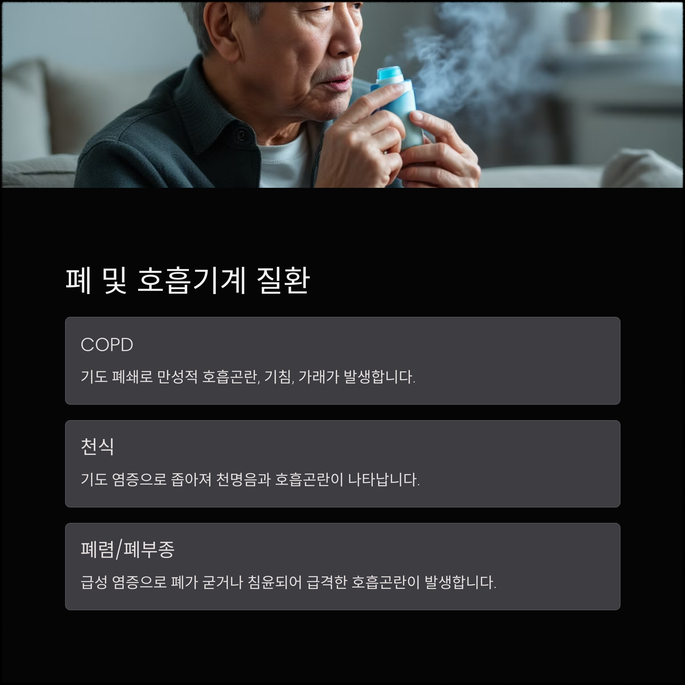- 천식(Asthma): 기도가 염증으로 좁아지며 천명음과 호흡곤란을 동반합니다