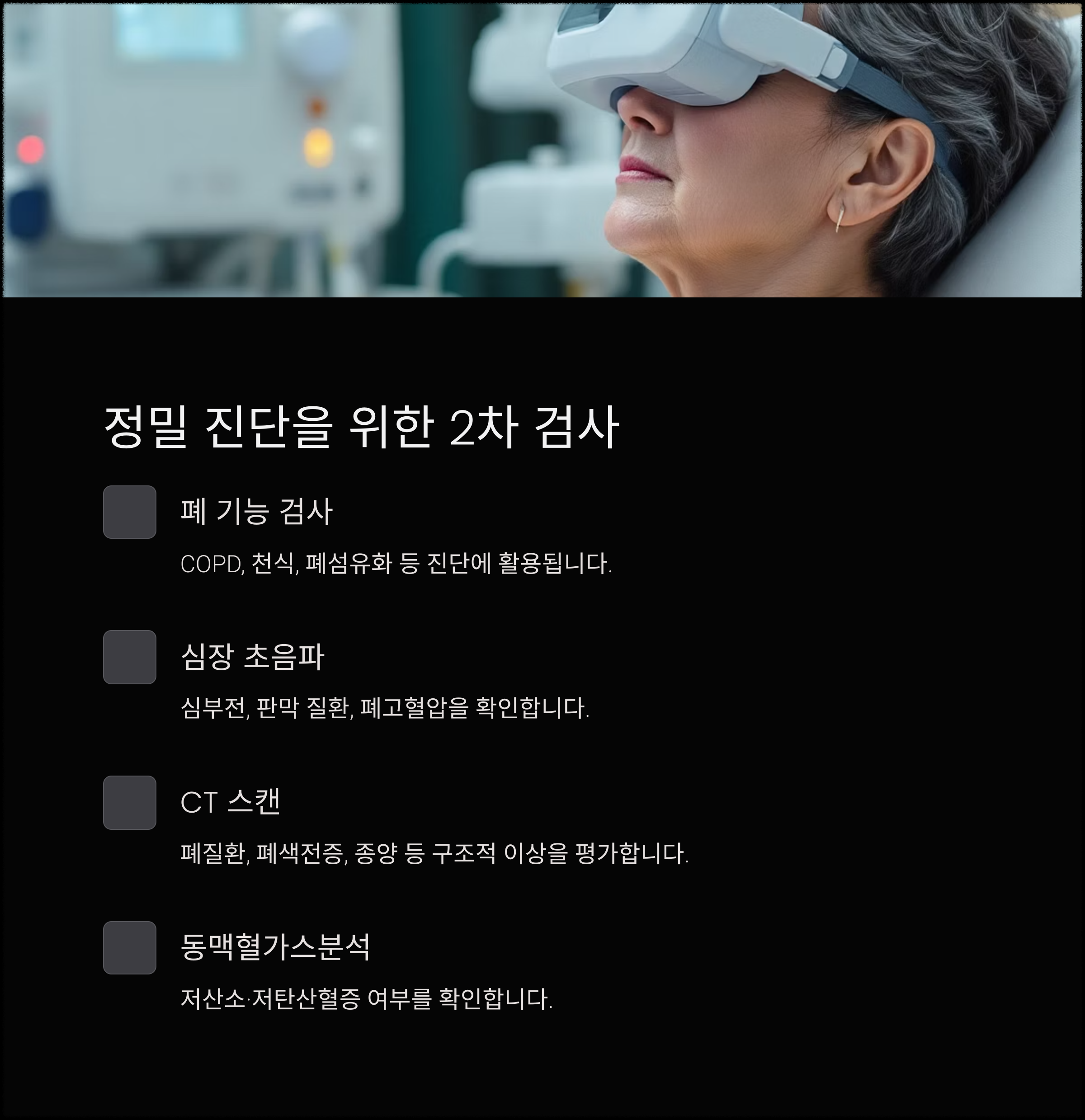 - CT 스캔: 폐질환, 폐색전증, 종양 등 구조적 이상 평가