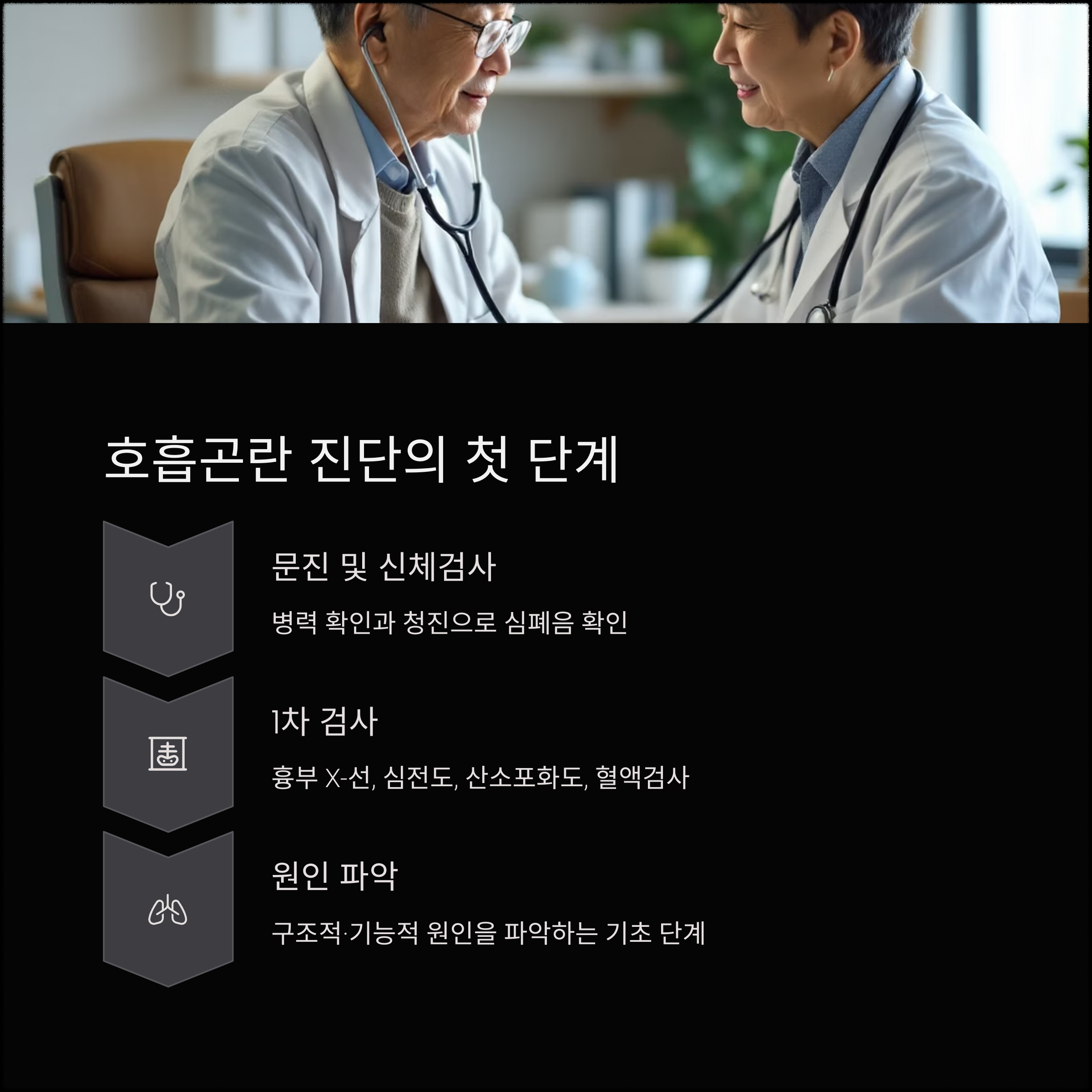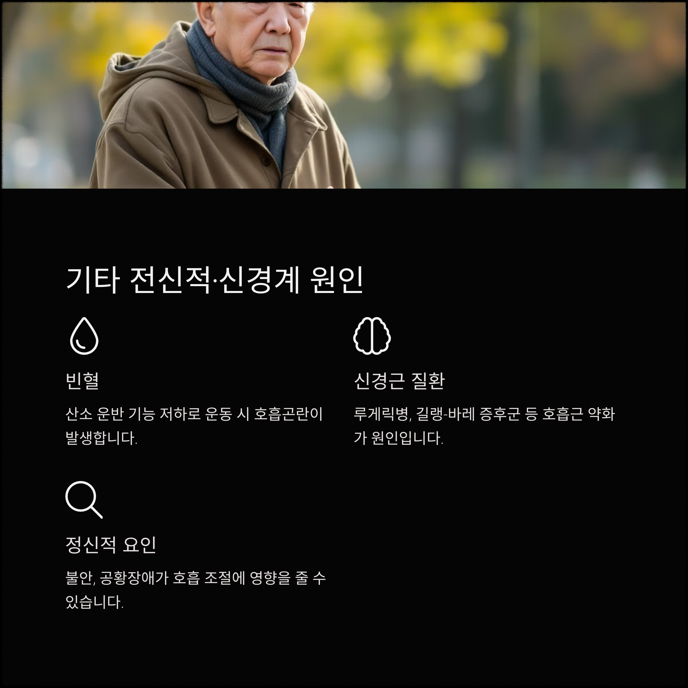 - 심근경색, 협심증, 부정맥 등 심장 혈류나 펌프 기능 이상도 호흡곤란을 유발할 수 있습니다