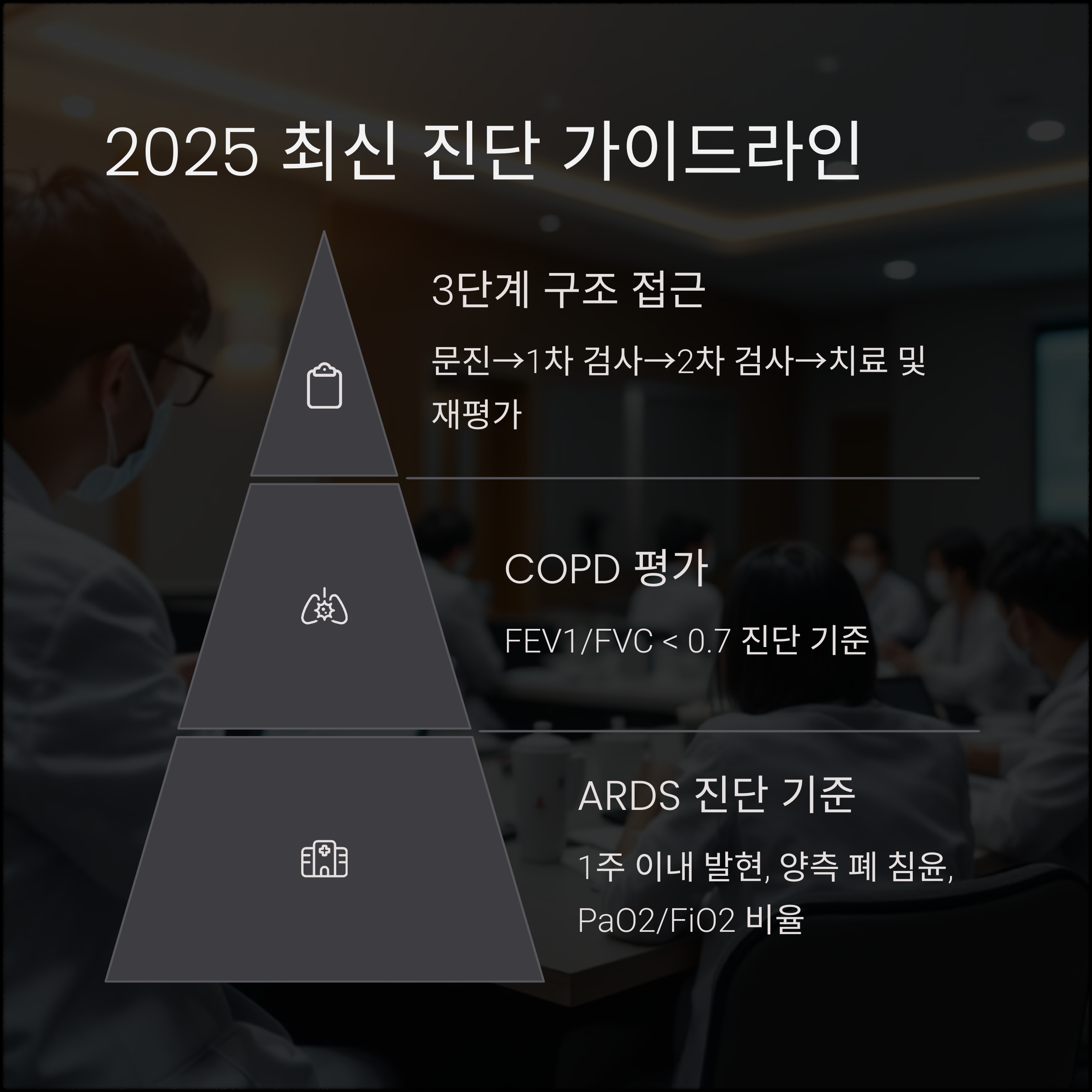 GOLD 2025 지침에서는 기관지 확장제 후 FEV1/FVC < 0.7이 COPD 진단 기준이며, 조기 예방과 조정이 중요합니다 - ARDS 진단 기준(Berlin 정의)