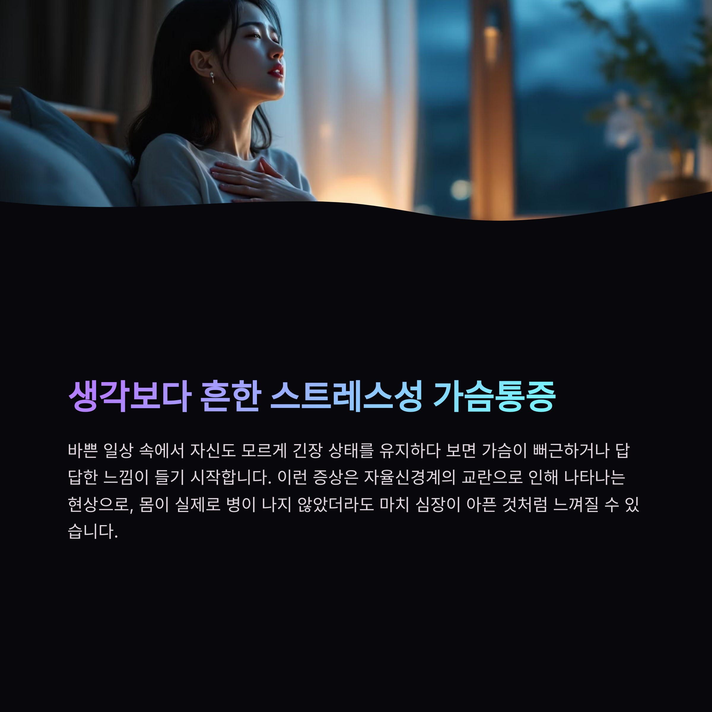 | 스트레스성 가슴통증 | 심장 이상 없이 나타나는 통증으로 자율신경계 불균형이 원인입니다 |