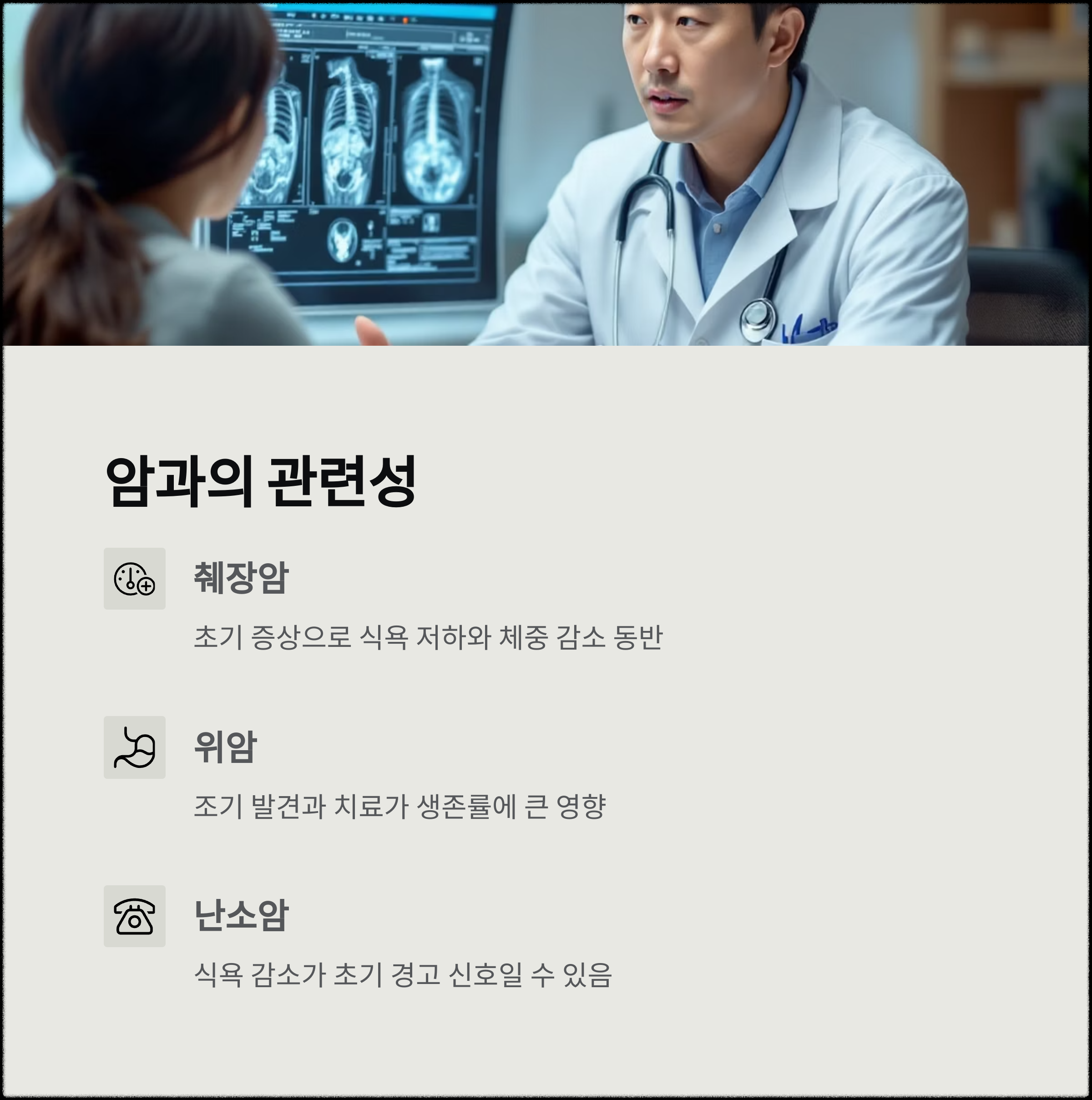 특정 암(췌장암, 위암, 난소암 등)은 초기 증상으로 식욕 저하와 체중 감소를 동반할 수 있습니다. 이 경우 조기 발견과 치료가 생존률에 큰 영향을 줍니다