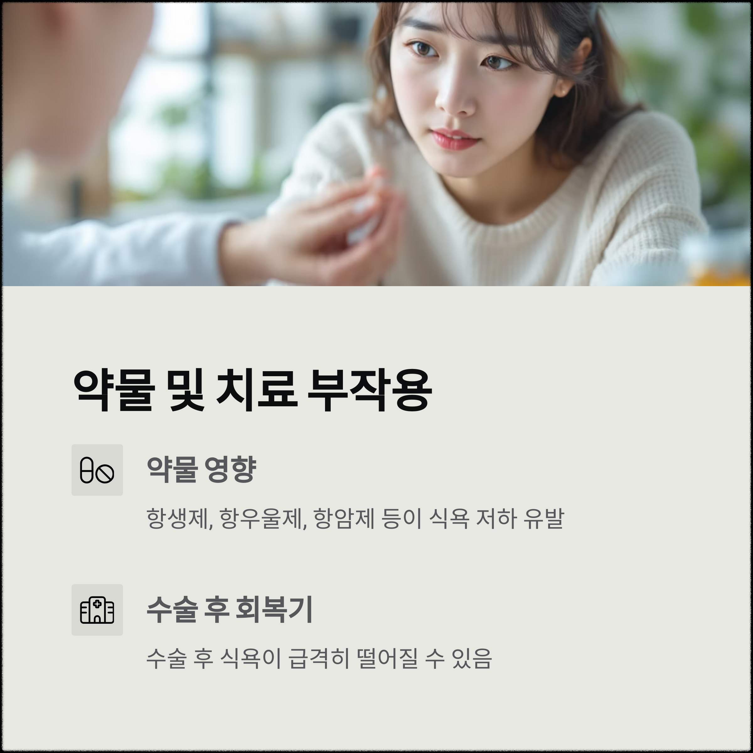 항생제, 항우울제, 항암제 등의 약물, 그리고 수술 후 회복기에는 식욕이 급격히 떨어질 수 있습니다