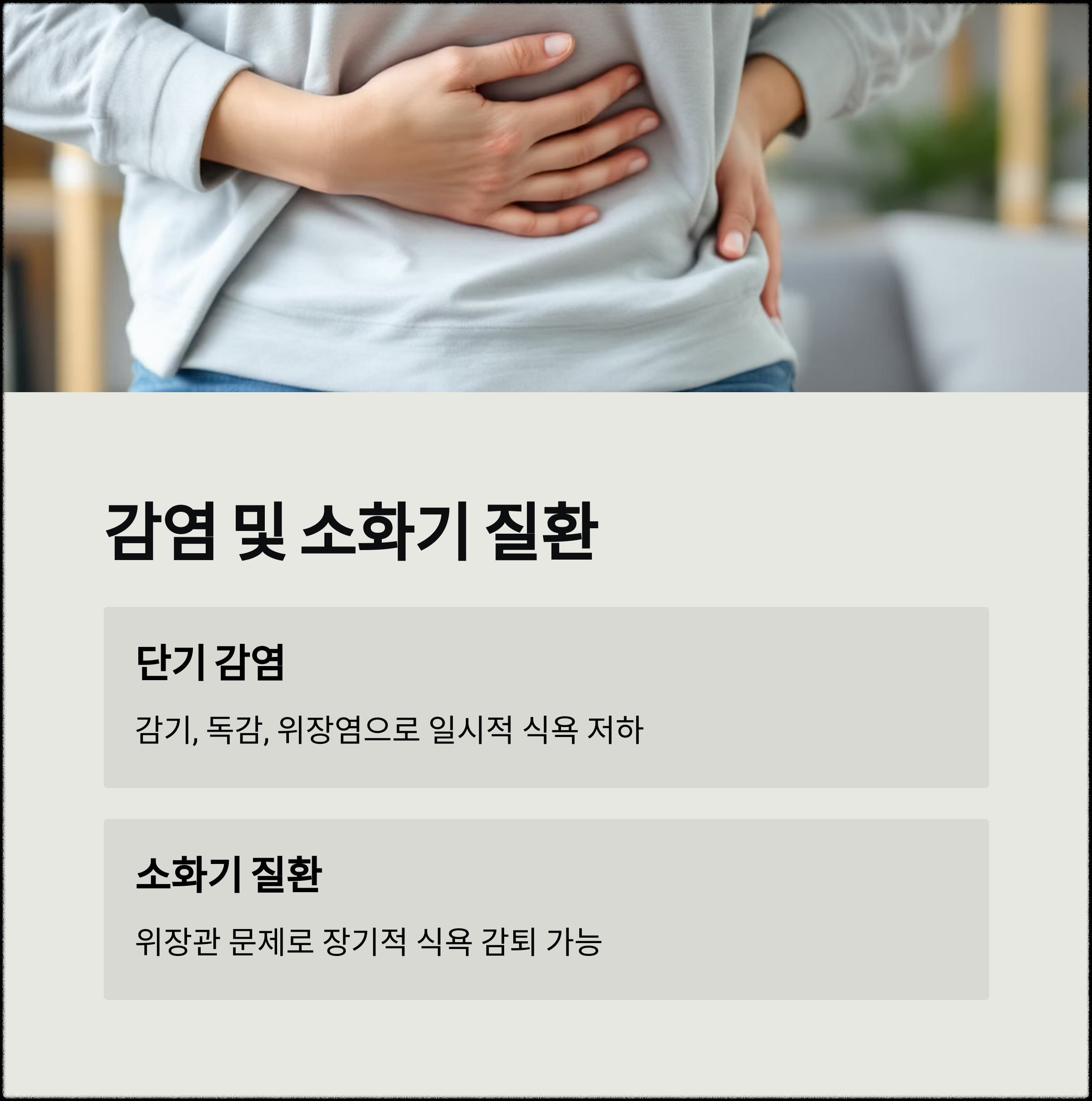 감기, 독감, 위장염과 같은 단기간 감염은 식욕 저하를 야기할 수 있으며, 회복과 함께 식욕이 회복되는 경우가 많습니다.