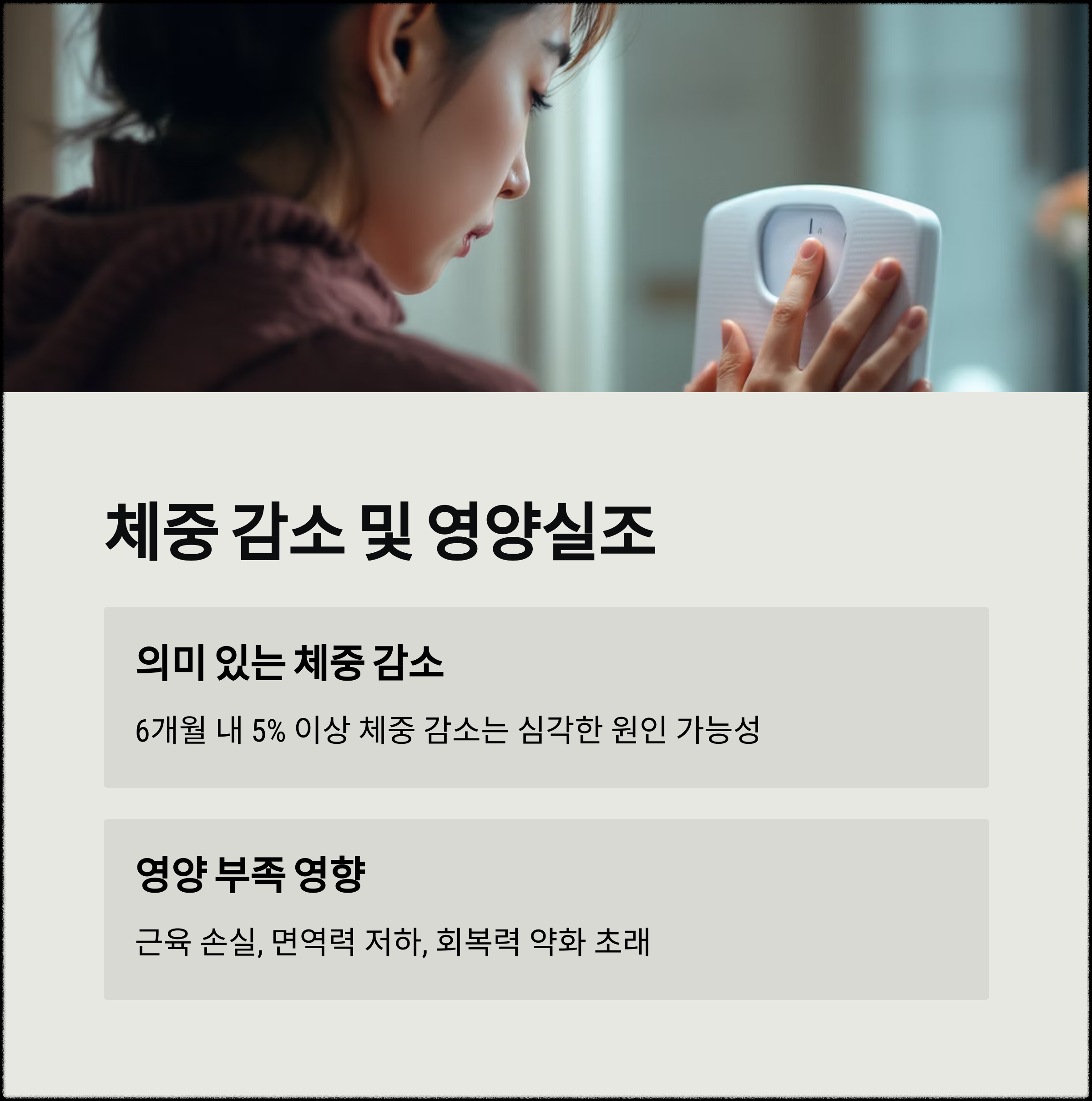6개월 이내에 의도하지 않은 체중 5% 이상 감소는 “의미 있는 체중 감소”로 간주되며, 악성 종양·위장관 질환·정신질환 등 심각한 원인이 있을 수 있어 반드시 평가가 필요합니다