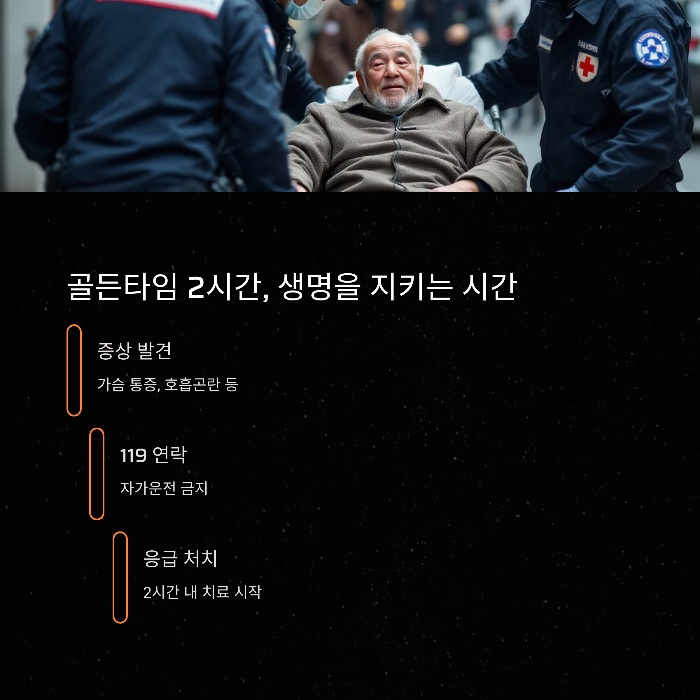 심근경색은 발생 후 2시간 안에 치료를 시작해야 생존율이 급격히 높아집니다.
