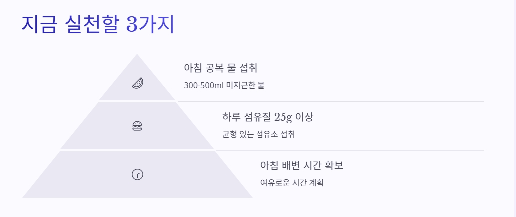 지금 이 순간부터 위 3가지를 꾸준히 실천하면, 아침마다 반복되는 변비 고통에서 벗어날 수 있습니다.