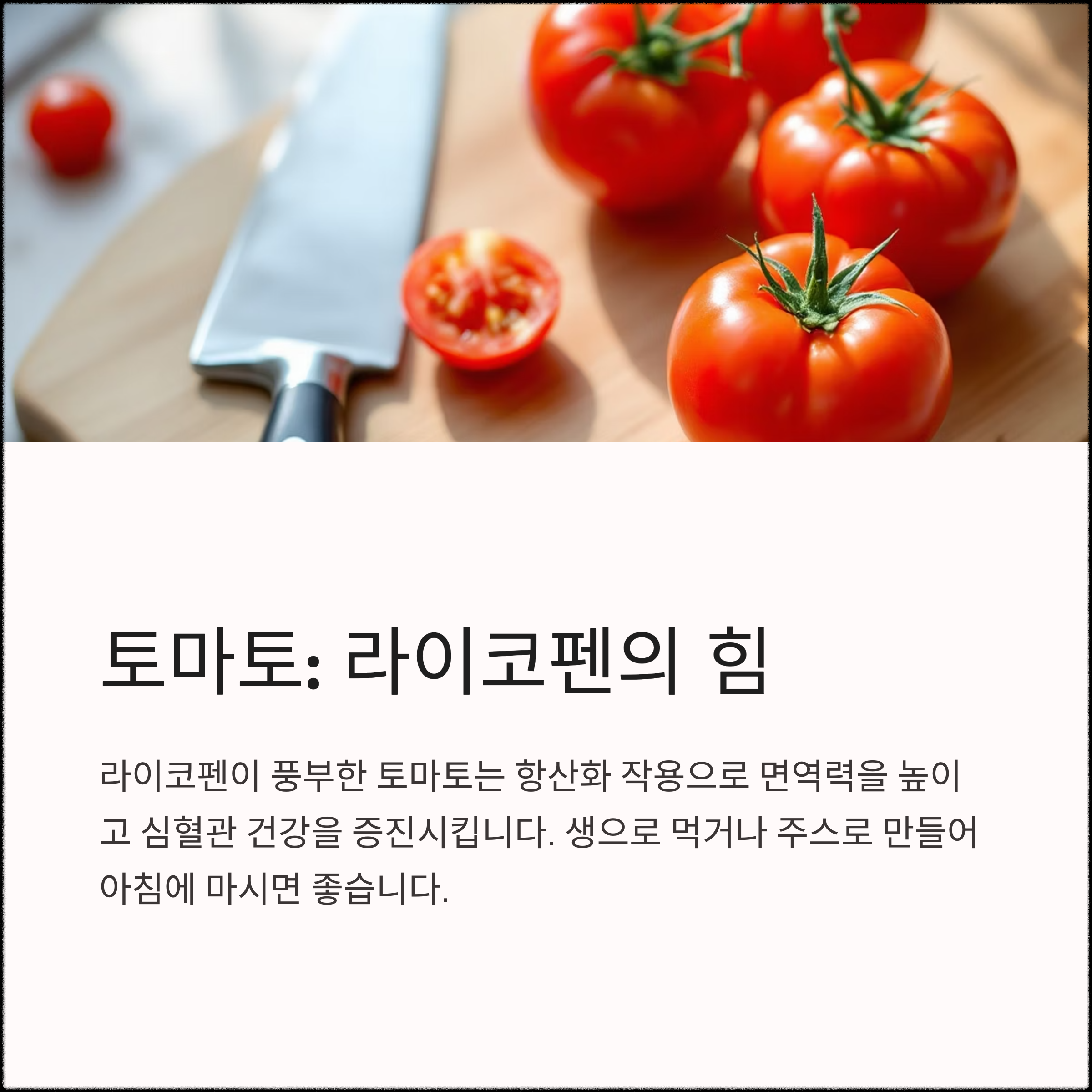 토마토는 라이코펜이 풍부하여 항산화 작용을 통해 면역력을 높이고, 심혈관 건강을 증진시키는 데 도움을