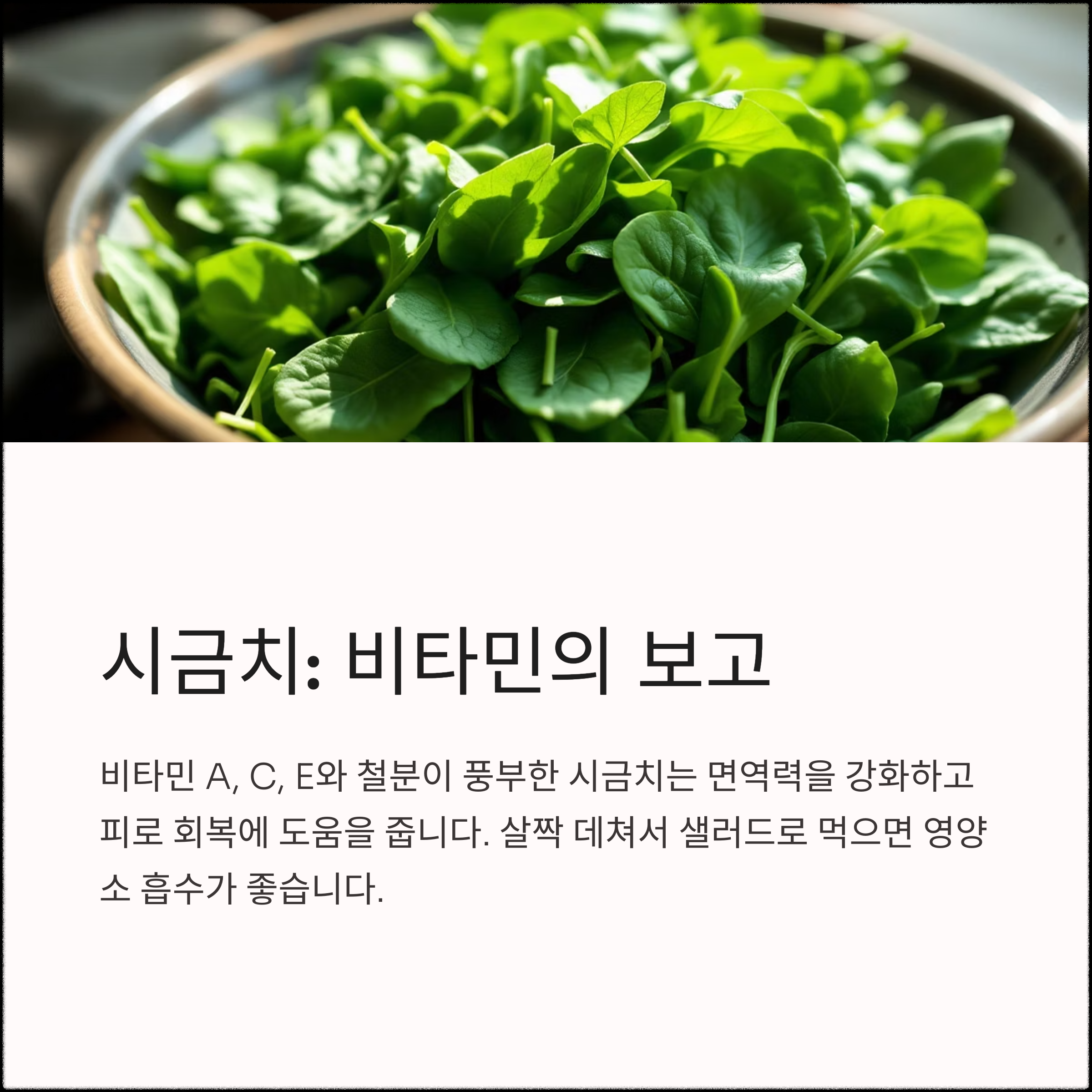 시금치는 비타민 A, C, E와 철분이 풍부하여 면역력을 강화하고, 피로 회복에 도움을 줍니다. 살짝 데쳐서