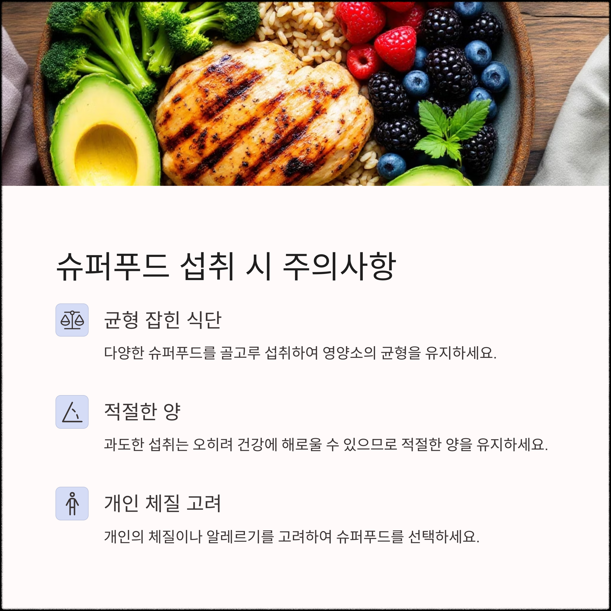 - 개인 체질 고려: 개인의 체질이나 알레르기를 고려하여 슈퍼푸드를 선택하세요.