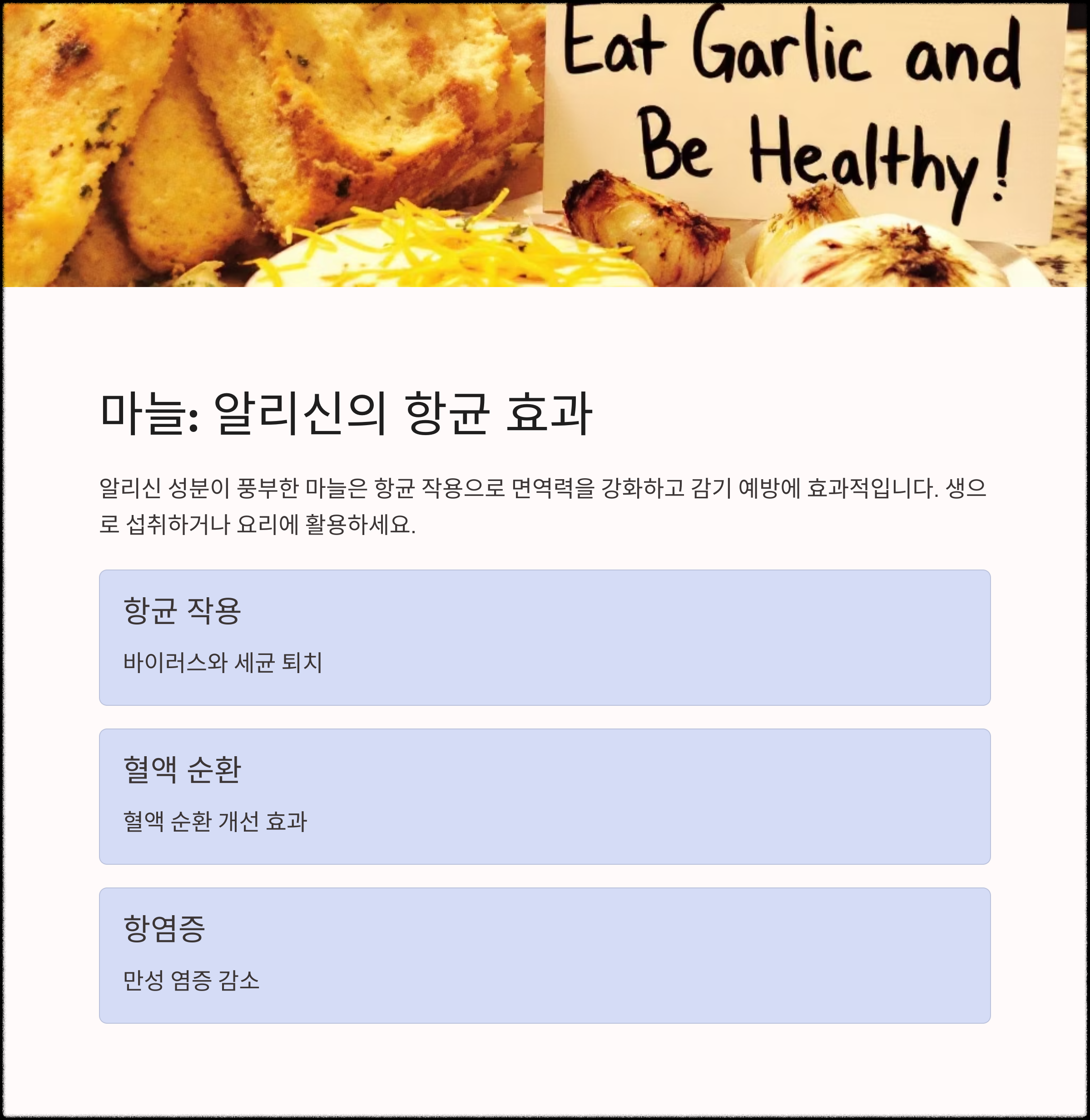 마늘은 알리신 성분이 풍부하여 항균 작용을 통해 면역력을 강화하고, 감기 예방에 효과적입니다. 생으로
