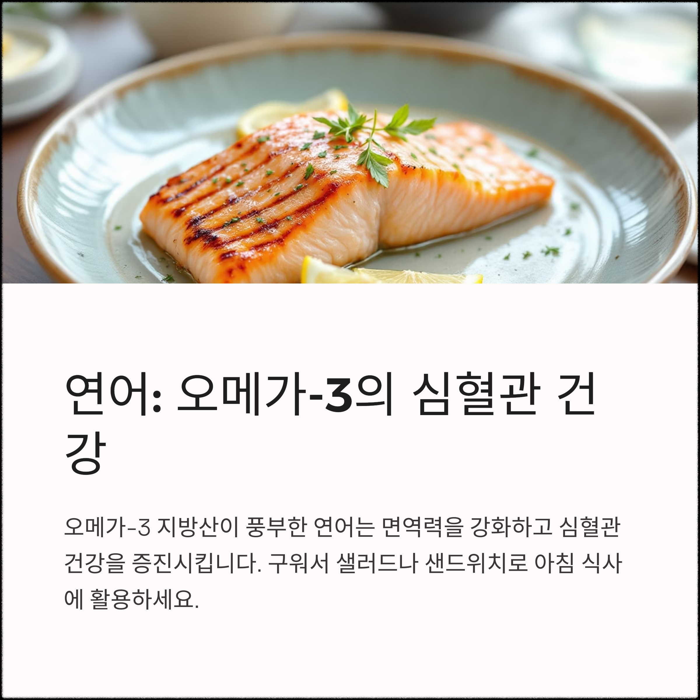 연어는 오메가-3 지방산이 풍부하여 면역력을 강화하고, 심혈관 건강을 증진시키는 데 도움을 줍니다. 구워서 샐러드에 곁들이거나 샌드위치로 만들어 아침 식사로 섭취하면 좋습니다. 하지만 연어는 상당히 비쌉니다 그렇기에 무조건 드시라고는 말을 못하겠네요. 개인적으로 여유가 된다면 드시는걸 권해 드립니다.