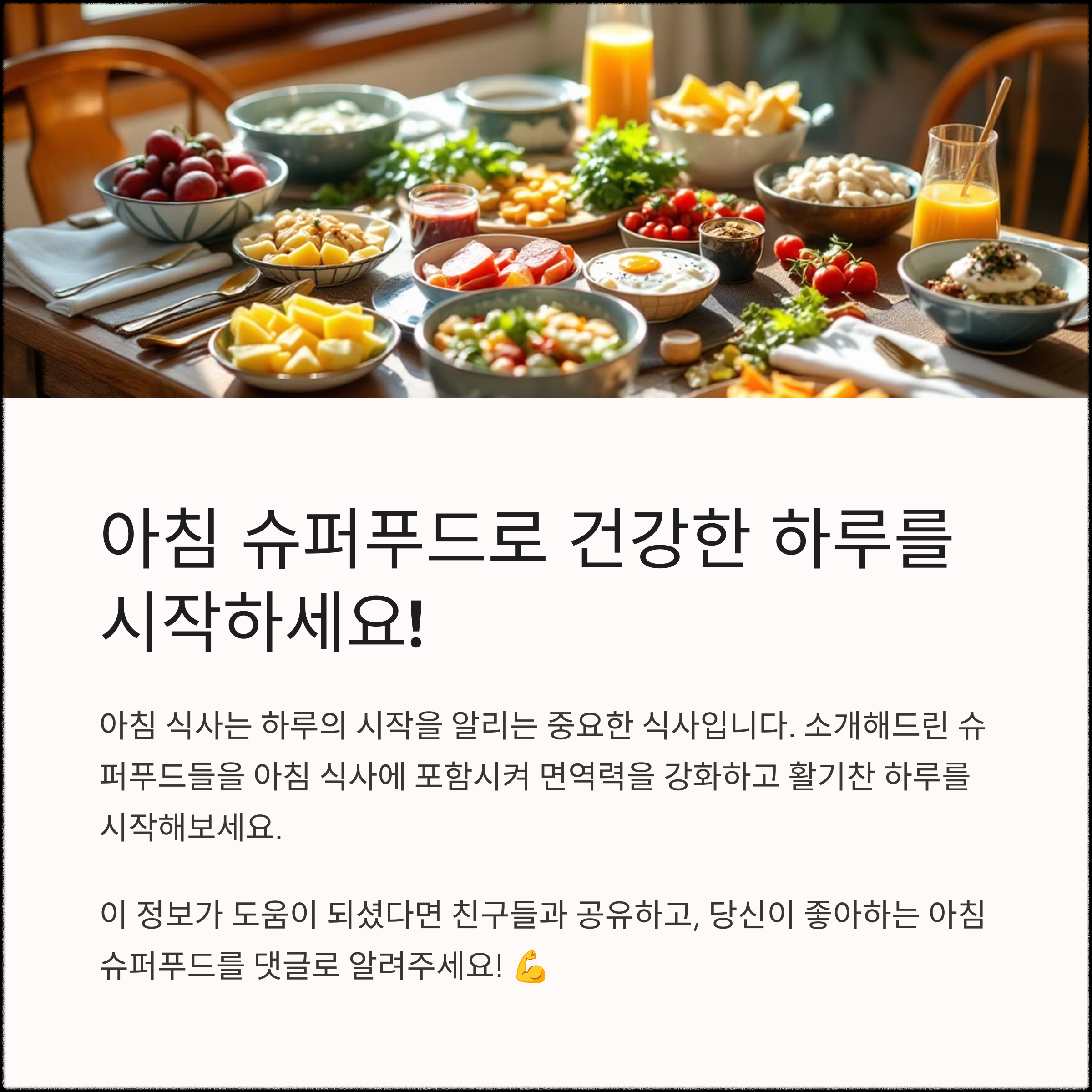아침 식사는 하루의 시작을 알리는 중요한 식사입니다. 위에서 소개한 슈퍼푸드들을 아침 식사에 포함시켜 면역력을 강화하고, 활기찬 하루를 시작해보세요. 건강한 식습관은 면역력을 높이고, 전반적인 건강을 유지하는 데 큰 도움이 됩니다.