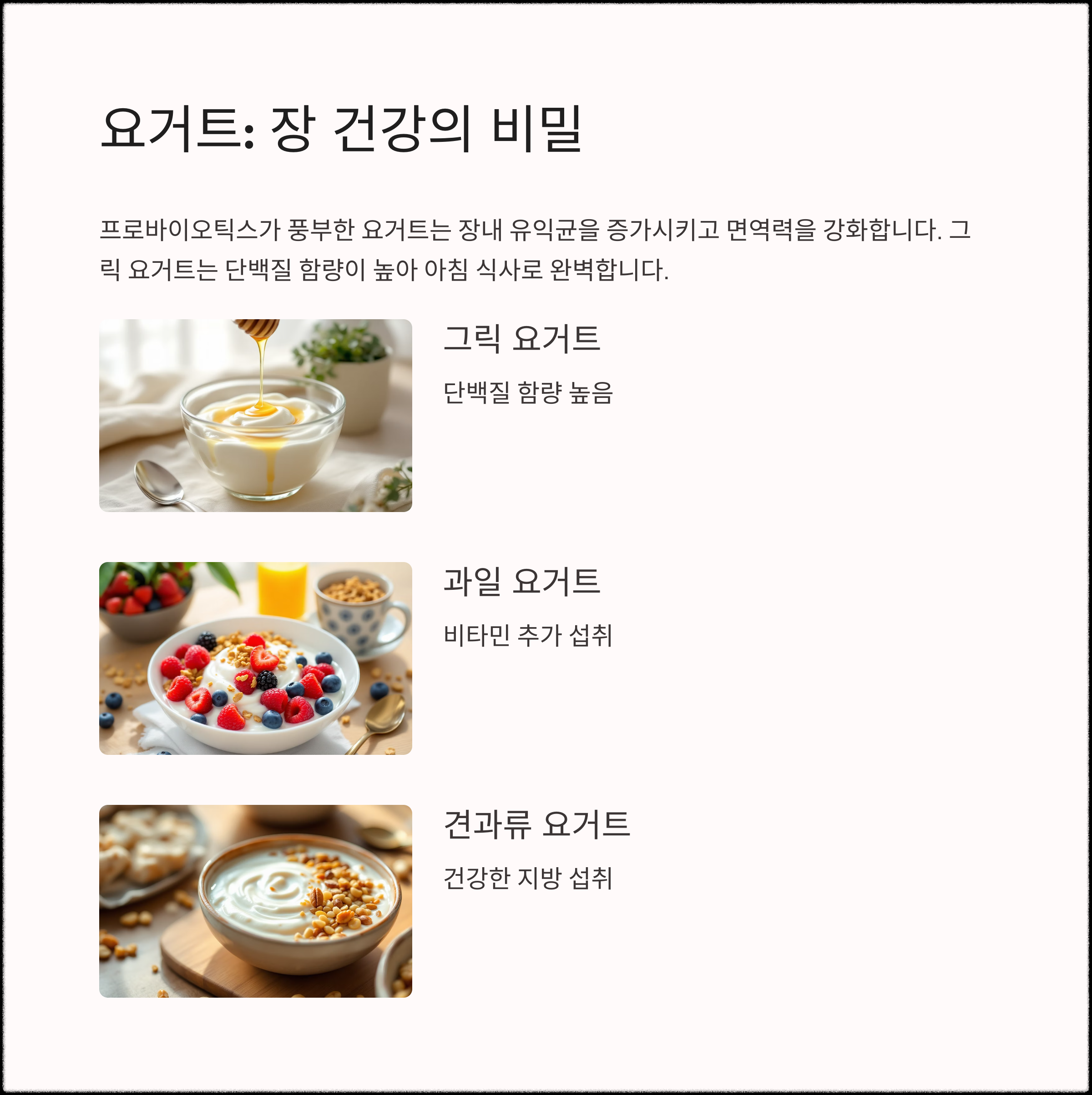 요거트는 프로바이오틱스가 풍부하여 장내 유익균을 증가시키고, 면역력을 강화하는 데 도움을 줍니다.