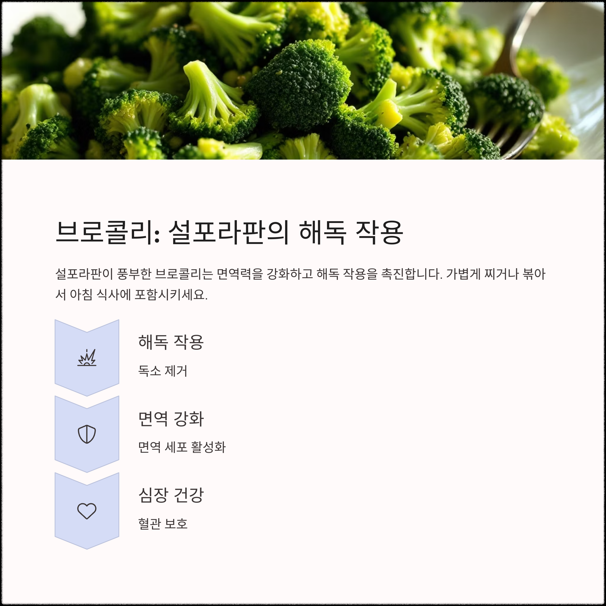 브로콜리는 설포라판이 풍부하여 면역력을 강화하고, 해독 작용을 촉진하는 데 도움을 줍니다. 가볍게 찌거나 볶아서 아침 식사에 포함시키면 좋은데 우리가 알아야 될 사항으로 브로콜리는 농약도 많이 쓰고 벌레등