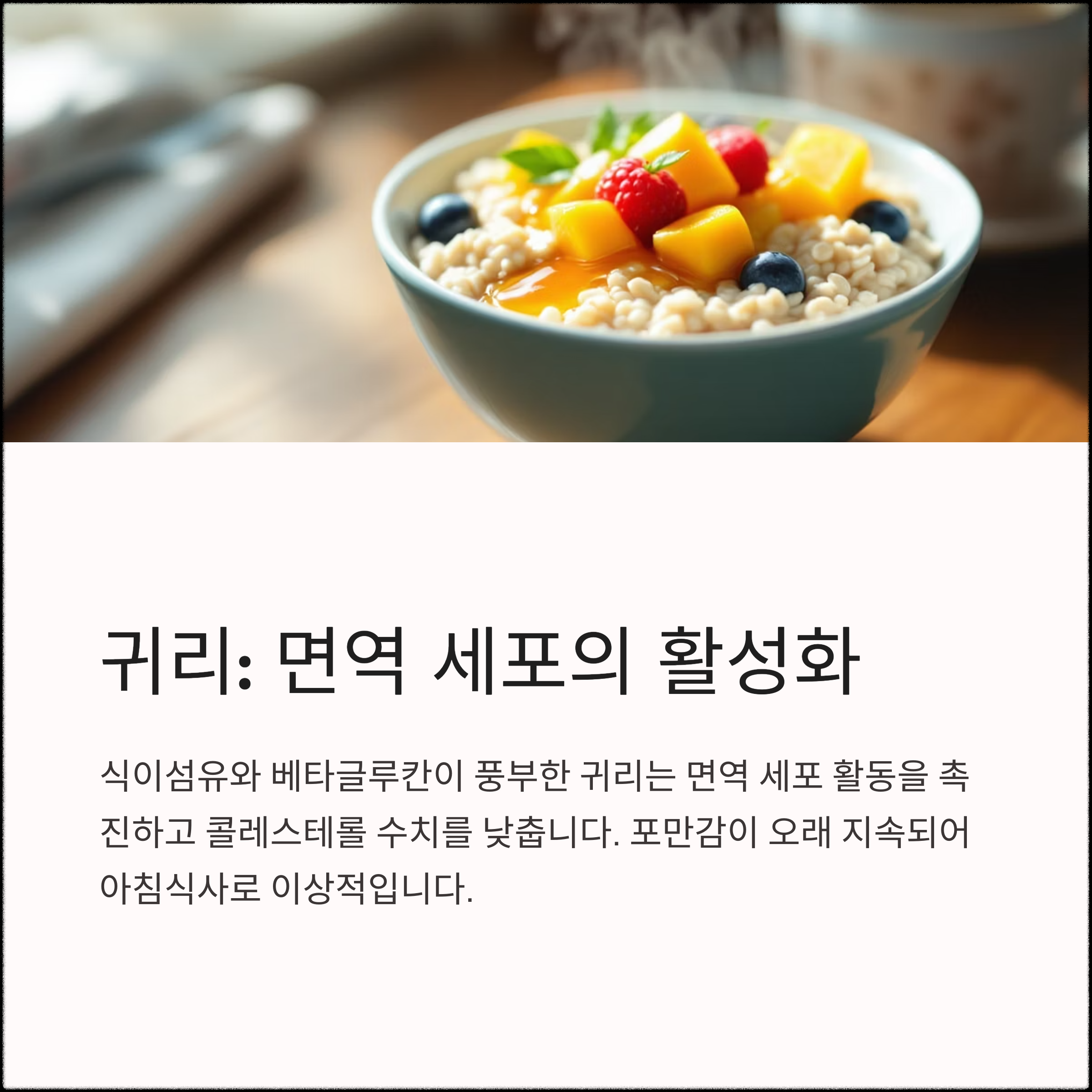 귀리는 식이섬유와 베타글루칸이 풍부하여 면역 세포의 활동을 촉진하고, 콜레스테롤 수치를 낮추는 데