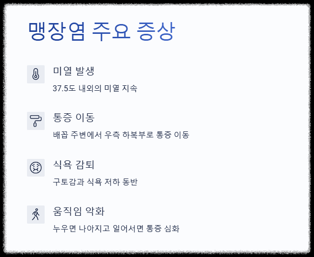 가장 흔하고 치명적인 원인 중 하나. 초기에는 배꼽 주위가 아프다가 시간이 지나면서 오른쪽 아랫배로 통증이 이동한다.- 특징: 누우면 괜찮은데 일어나면 심해짐, 미열, 구토, 식욕부진 동반