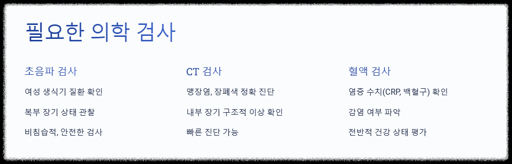 - CT 검사 : 맹장염, 장염, 장폐색 등을 빠르고 정확하게 진단