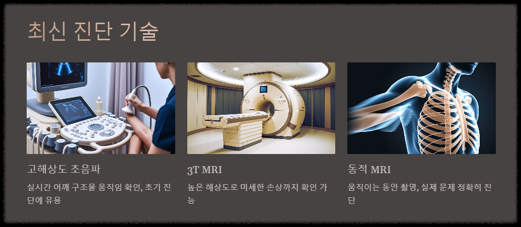 - 동적 MRI: 어깨를 움직이는 동안 촬영하여 실제 일상생활에서의 문제를 더 정확히 진단합니다.