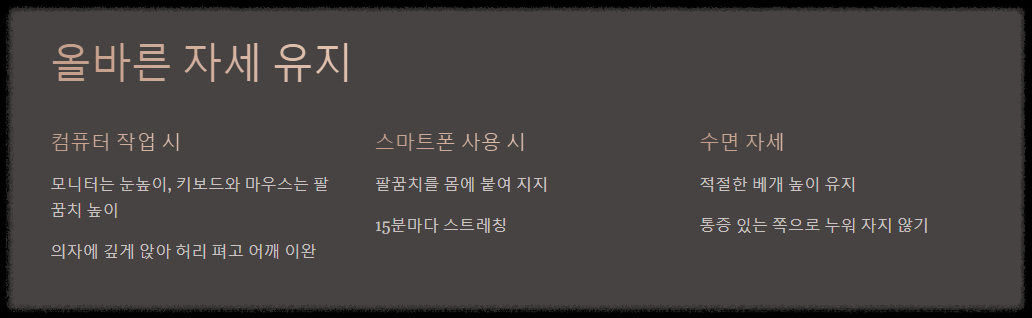 - 스마트폰 사용 시: 팔꿈치를 몸에 붙여 지지하고, 목을 과도하게 숙이지 마세요. 가능하면 15분마다 스트레칭을 해주는 것이 좋습니다.