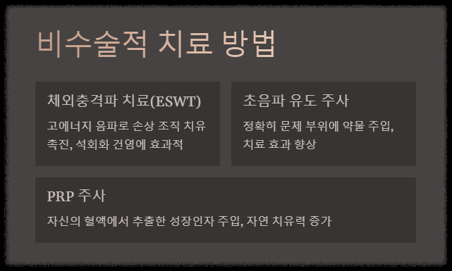 - 체외충격파 치료(ESWT): 고에너지 음파를 이용해 손상된 조직의 치유를 촉진하는 방법으로, 특히 석회화 건염에 효과적입니다.