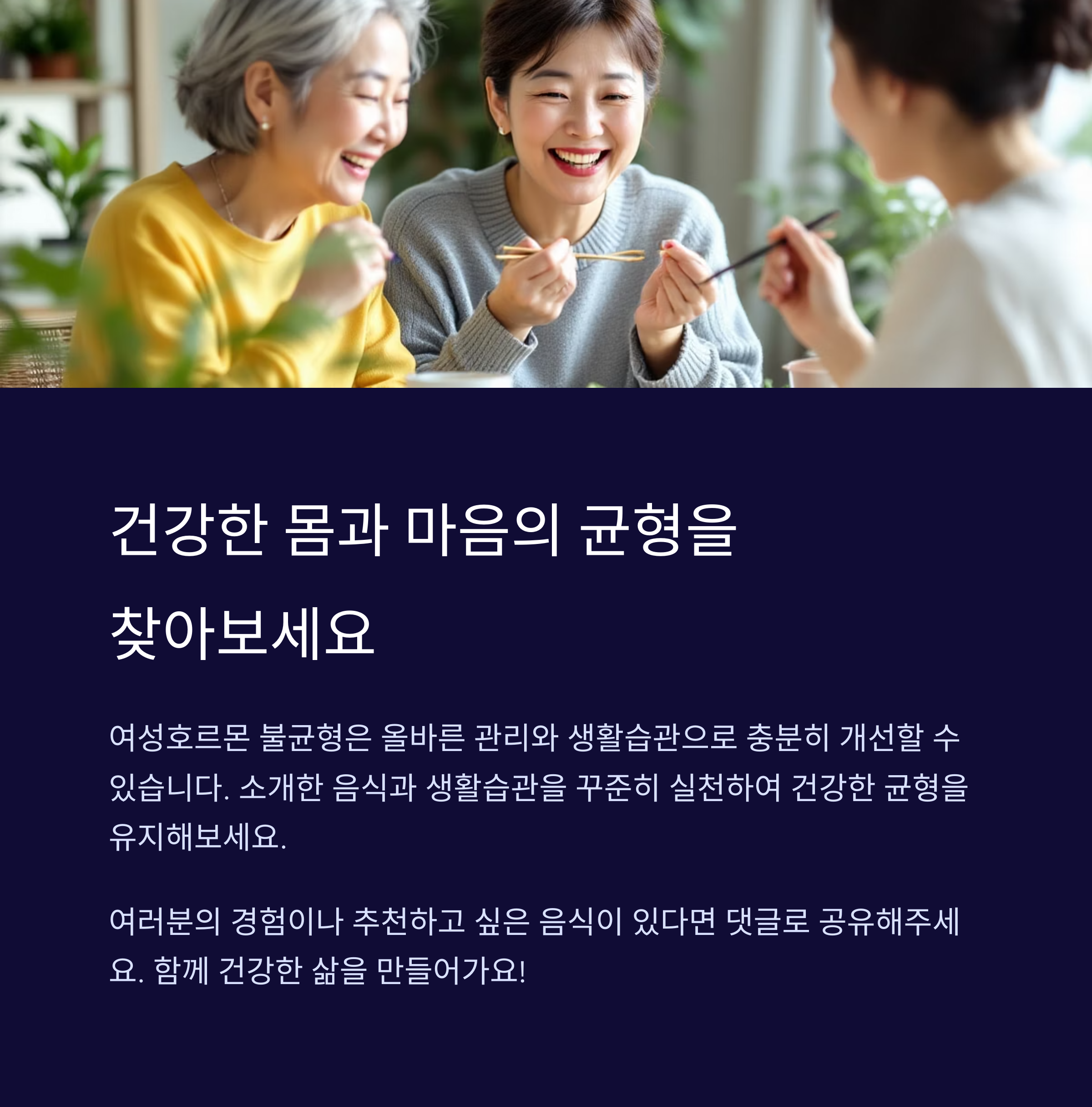 여성호르몬 불균형 관리에 도움이 된 경험이나 추천하고 싶은 음식이 있다면 댓글로 공유해주세요. 여러분의 소중한 이야기가 많은 분들께 큰 도움이 됩니다. 함께 건강한 삶을 만들어가요!