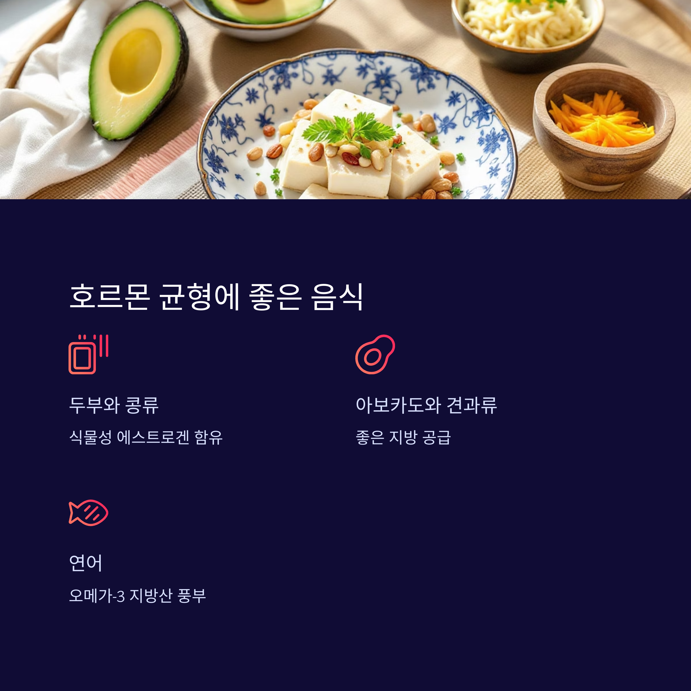 | 생리불순, 피로감, 우울감 | 두부, 연어, 아보카도, 견과류 | 충분한 수면, 스트레스 관리 |