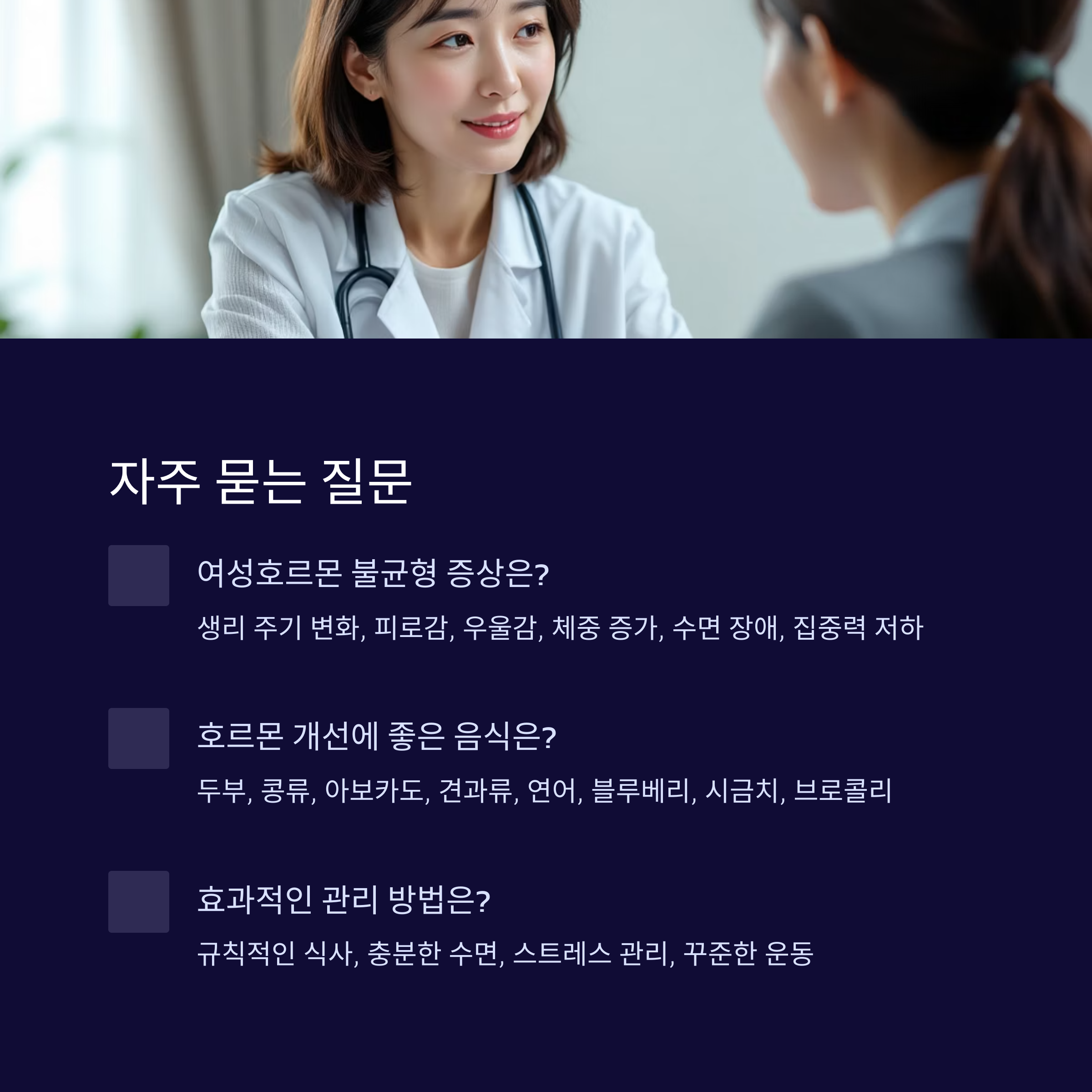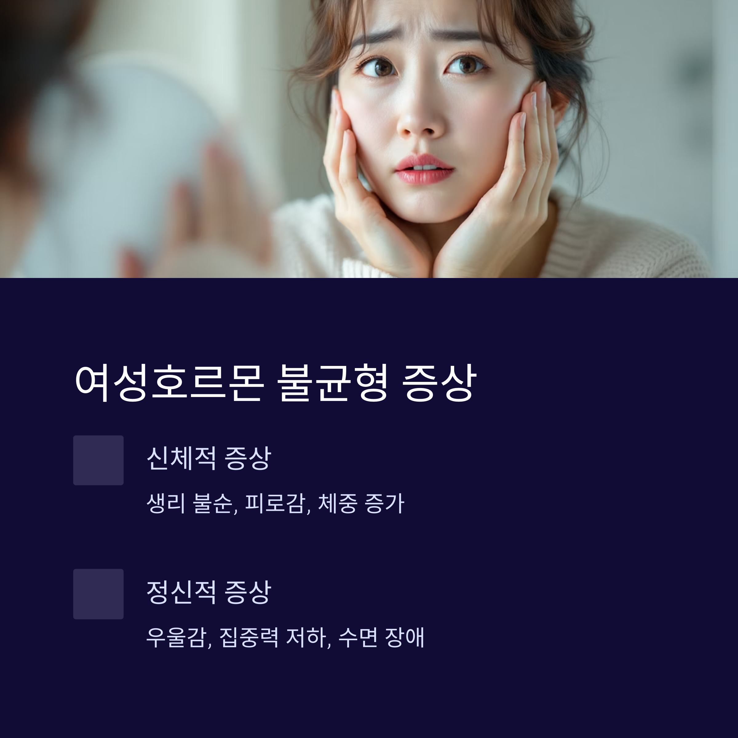 | 여성호르몬 불균형 증상 | 생리 불순, 피로감, 우울감, 체중 증가 등이 있습니다. |