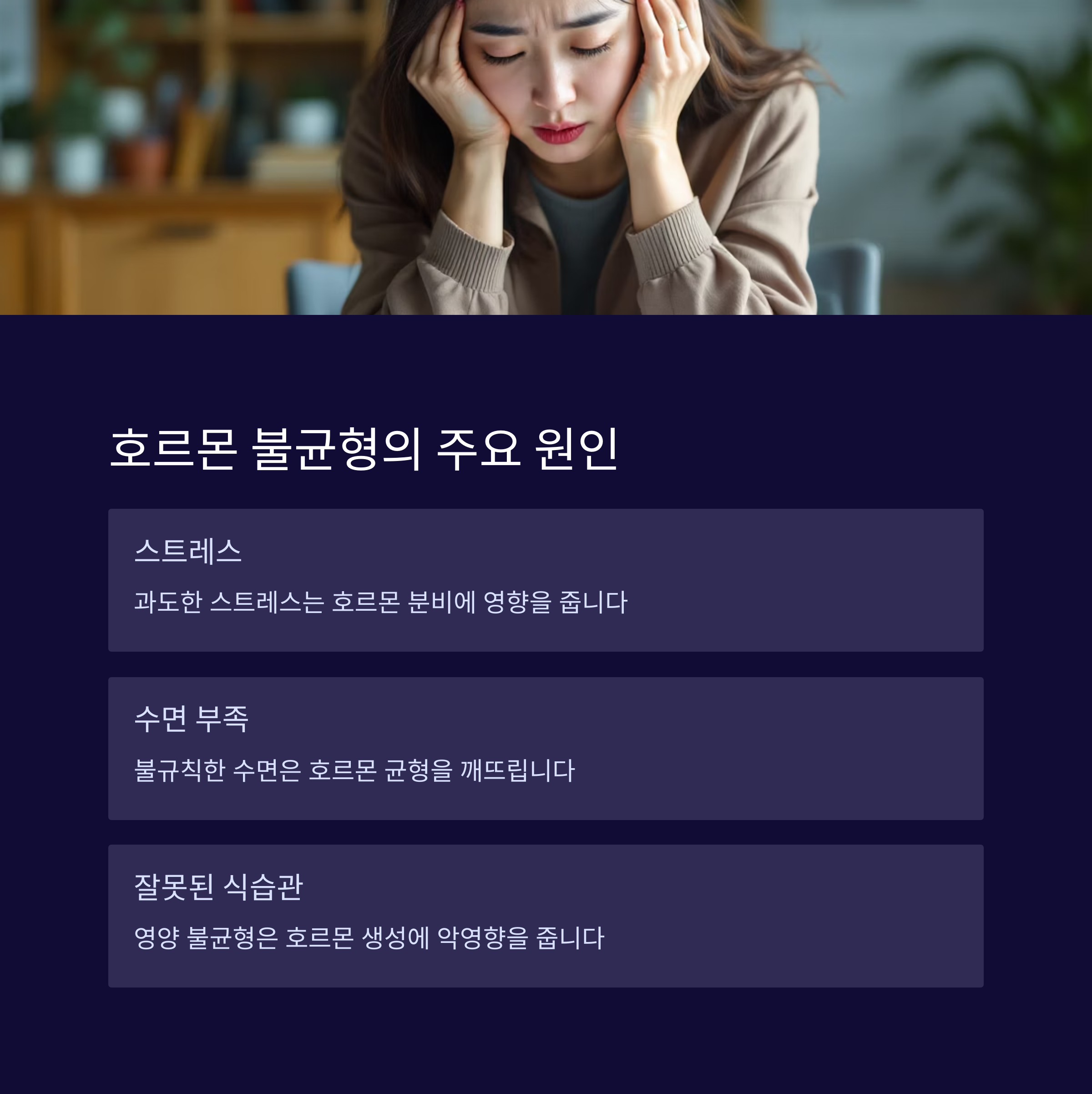 무엇보다도 꾸준한 식습관 개선과 더불어 충분한 수면과 스트레스 관리가 필수적입니다. 하루 7시간 이상의 숙면을 유지하고, 명상이나 가벼운 운동으로 스트레스를 해소하면 호르몬 균형 유지에 큰 도움이 됩니다. 작은 실천이지만 지속적인 노력이 건강한 몸과 마음을 만들어 줍니다.