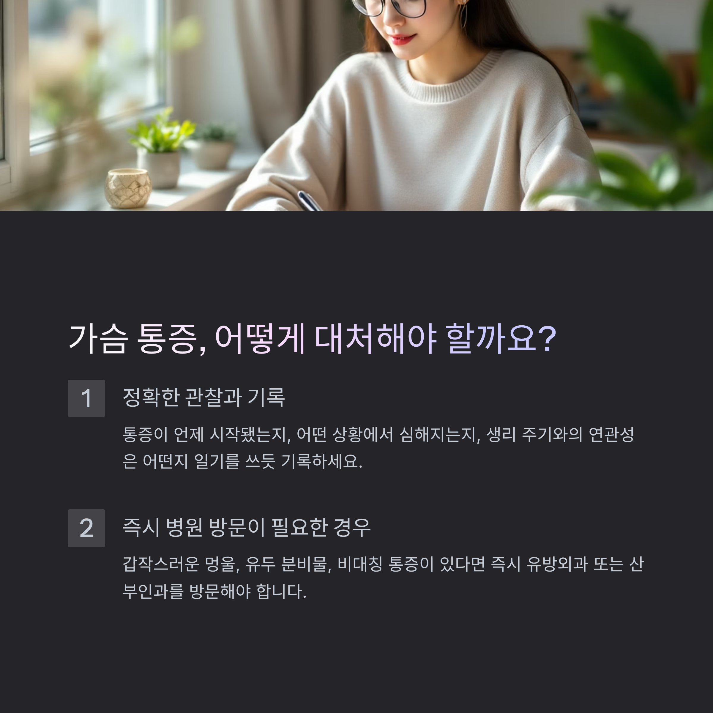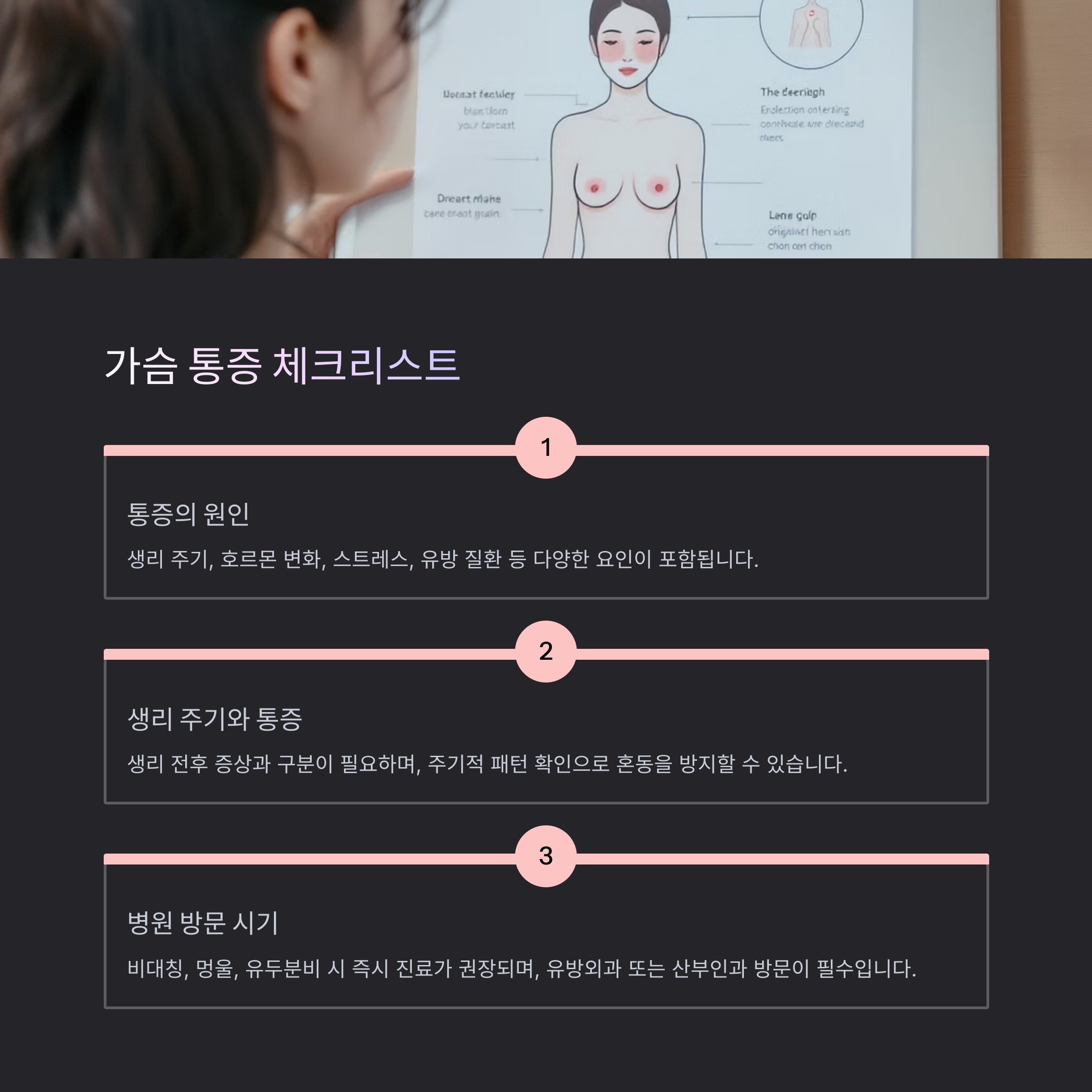 통증 기록과 행동 실천이 핵심 | 주기적 패턴 확인으로 혼동 방지 | 유방외과 또는 산부인과 방문 필수 |