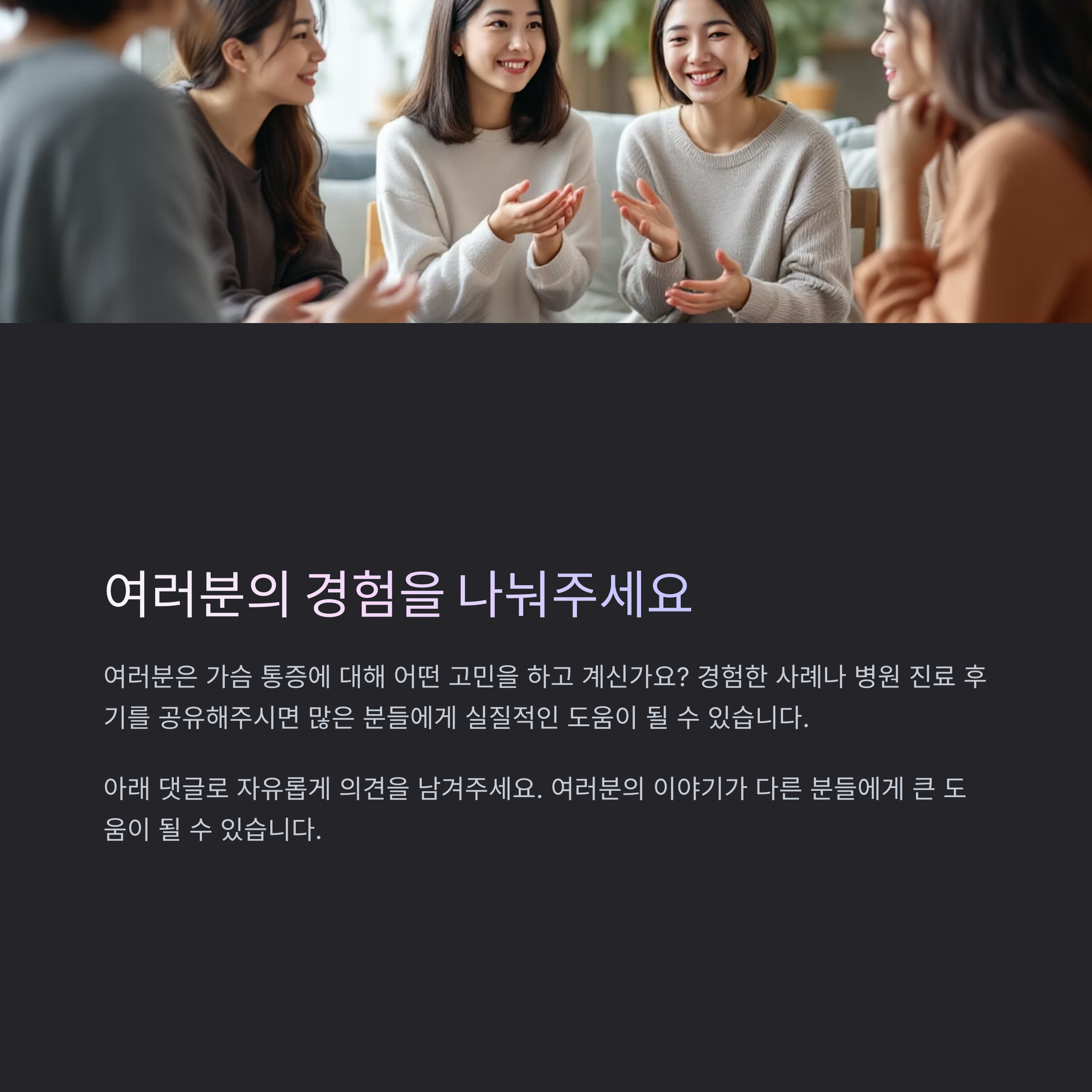여러분은 가슴 통증에 대해 어떤 고민을 하고 계신가요? 경험한 사례나 병원 진료 후기를 공유해주시면 많은 분들에게 실질적인 도움이 될 수 있습니다. 아래 댓글로 자유롭게 의견을 남겨주세요.