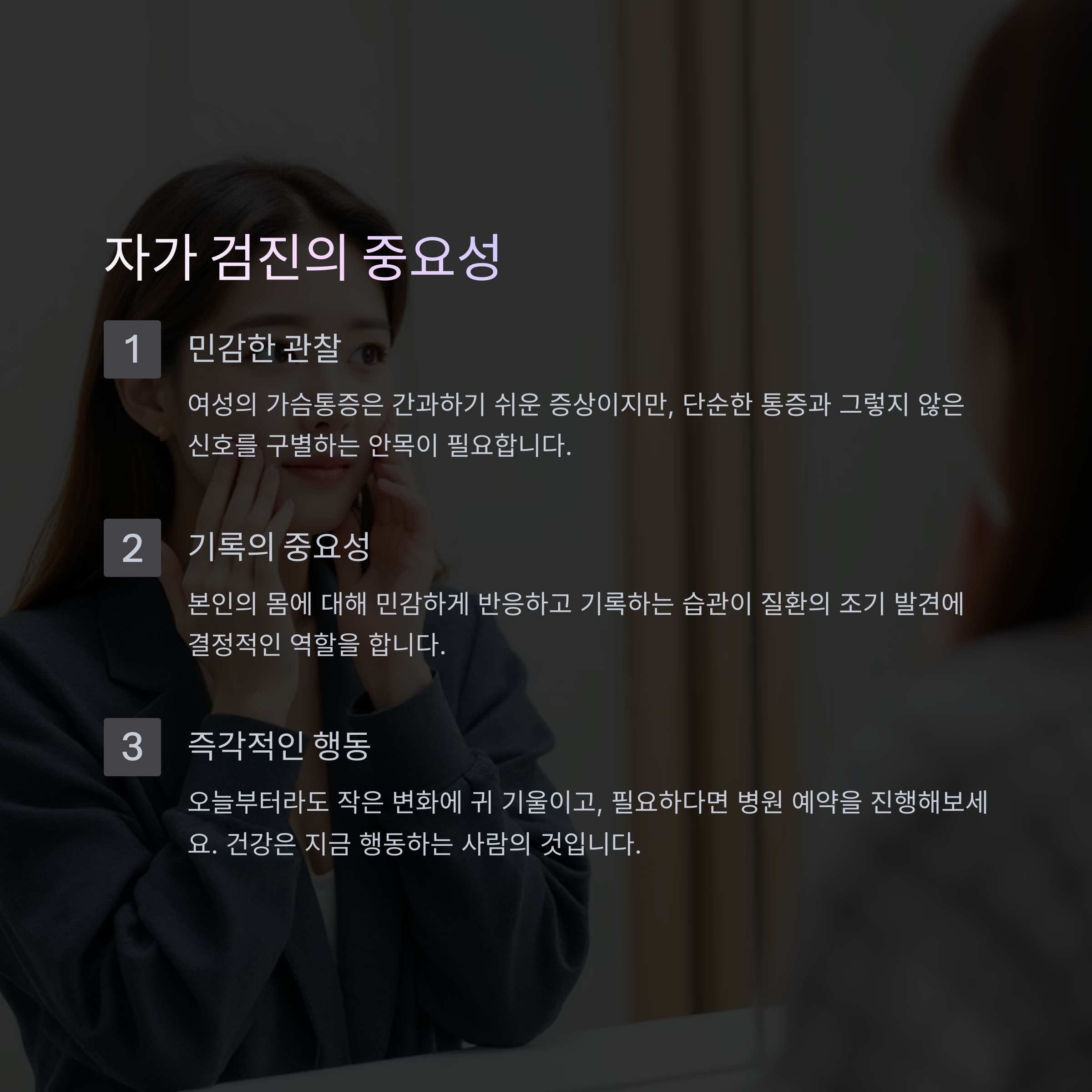 가슴통증을 경험한 뒤, 자신이 어떤 행동을 해야 할지 모를 경우 가장 먼저 고려해야 할 것은 정확한 관찰입니다. 통증이 언제 시작됐는지, 어떤 상황에서 심해지는지, 생리 주기와의 연관성은 어떤지 일기를 쓰듯 기록하는 것이 유용합니다. 이러한 기록은 병원에서 정확한 진단을 내리는 데 매우 큰 도움이 됩니다. 또한, 갑작스러운 멍울, 유두 분비물, 비대칭 통증이 있다면 즉시 유방외과 또는 산부인과를 방문해야 합니다. 행동을 미루지 말고 지금, 본인의 건강 상태를 체크하는 것이 건강을 지키는 최고의 방법입니다.