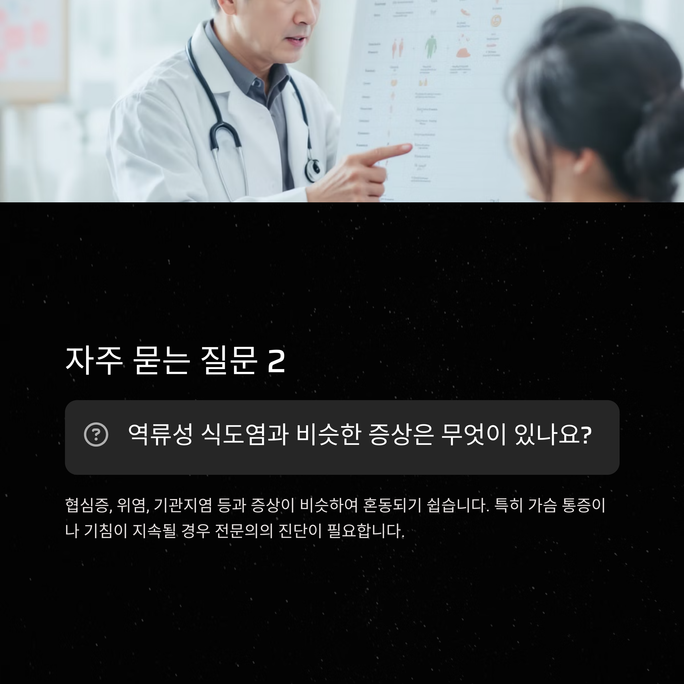 속쓰림, 가슴 통증, 목 이물감, 기침, 쉰 목소리 | 과식, 야식, 음주, 스트레스, 비만, 취침 직전 식사 | 식사 조절, 규칙적 생활, 체중관리, 바로 눕지 않기 |