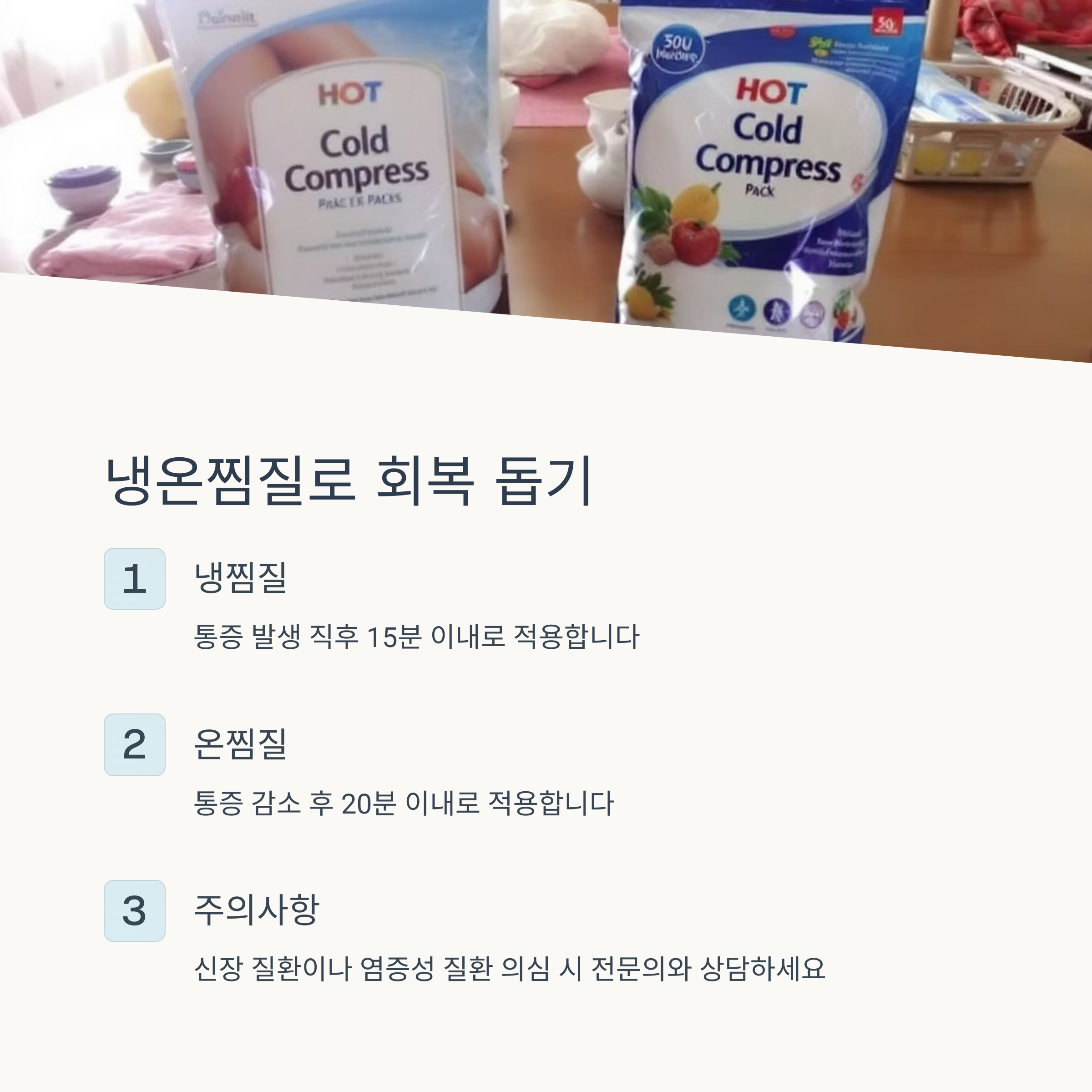 통증이 있는 초기에는 냉찜질, 이후 회복 단계에서는 온찜질이 효과적입니다.