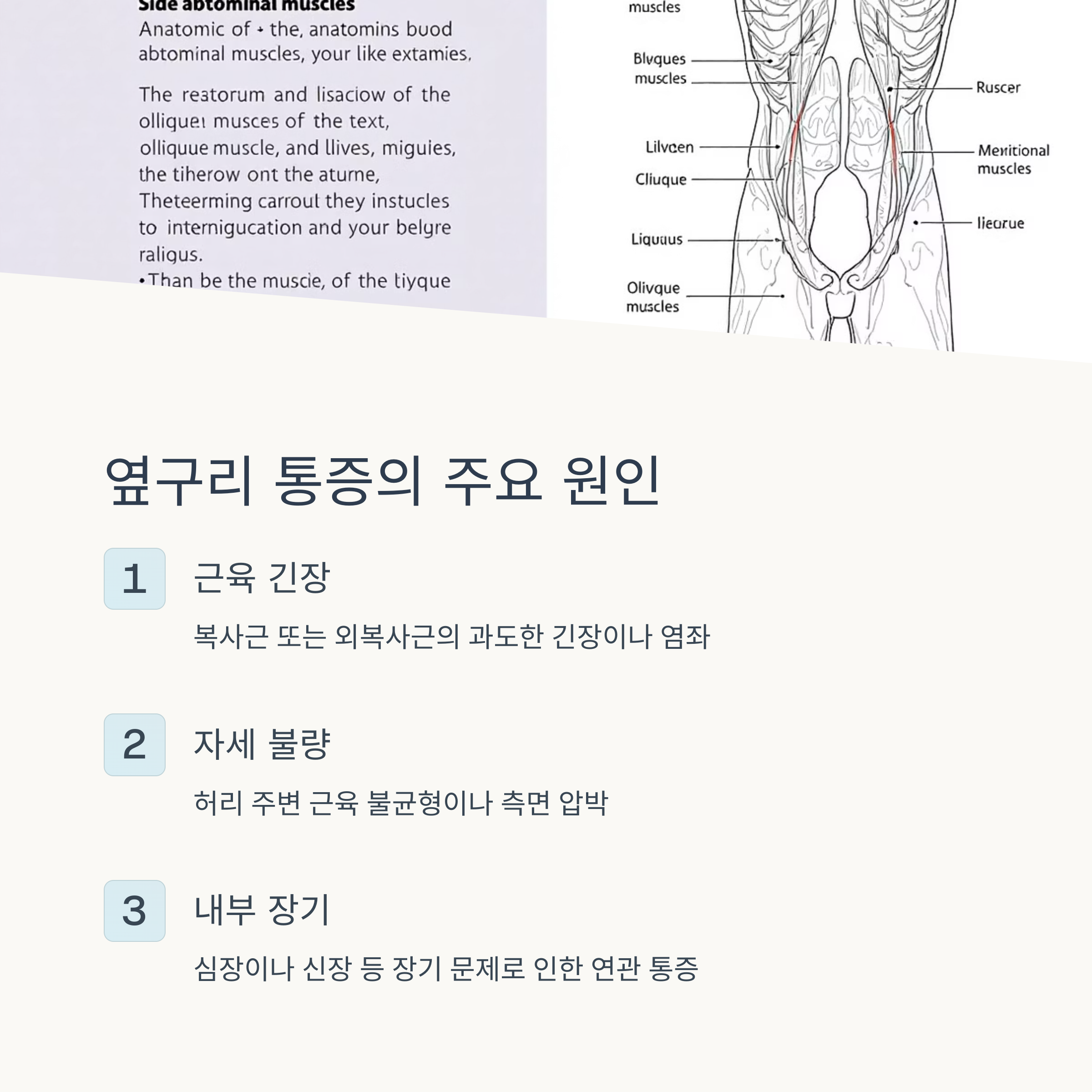 옆구리 통증은 다양한 원인으로 발생할 수 있지만, 일반적으로 다음의 세 가지가 가장 흔합니다.