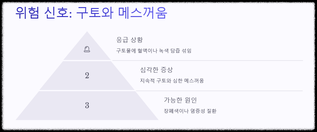 단순한 소화불량이라면 가벼운 메스꺼움만 느낄 수 있지만, 지속적인 구토와 심한 메스꺼움은 장폐색이나 염증성 질환의 신호일 수 있습니다. 특히 구토물에 혈액이나 담즙(녹색 액체)이 섞여 있다면 응급 상황으로 간주해야 합니다.