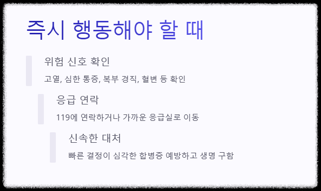 여러분의 건강은 무엇과도 바꿀 수 없는 소중한 자산입니다. 몸이 보내는 경고 신호를 무시하지 말고, 적절한 시기에 적절한 도움을 구하는 것이 중요합니다. 특히 고열, 심한 통증, 복부 경직, 혈변 등의 증상이 있다면 즉시 119에 연락하거나 응급실로 향하세요. 건강에 관한 한, 과도한 걱정보다는 늦은 대처가 더 위험합니다. 지금 바로 행동하세요. 여러분의 빠른 결정이 심각한 합병증을 예방하고 생명을 구할 수 있습니다.