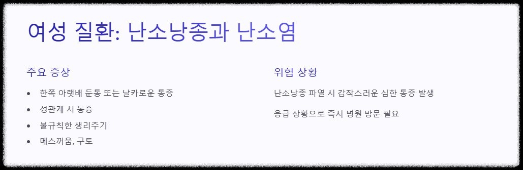 특히 난소낭종이 파열되면 갑작스러운 심한 통증과 함께 응급 상황이 될 수 있으니 주의가 필요합니다.
