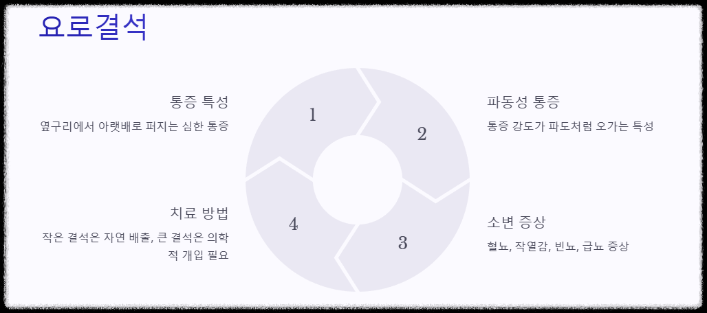신장에서 생성된 결석이 요관을 통해 내려오다가 오른쪽 요관에 걸리면 극심한 통증을 유발할 수 있습니다. 요로결석의 특징적인 증상은 다음과 같습니다: